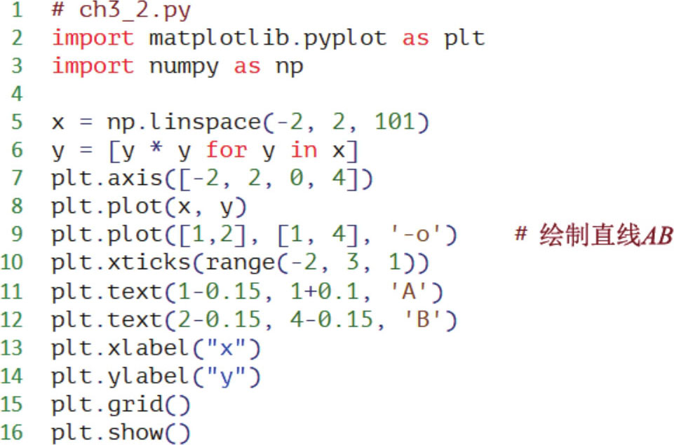 程序实例ch3_2.py: 重新设计ch3_1.py,但是更改 B 点的位置为(2, 4),同时连接 A 点和 B 点。