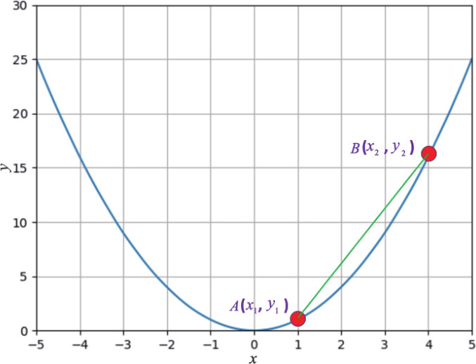 由上图知, A 点坐标( x 1 , y 1 )其实是(1, 1), B 点坐标 x 2 , y 2 其实是(4, 16),由上述公式我们可以得到直线 AB 的斜率是: