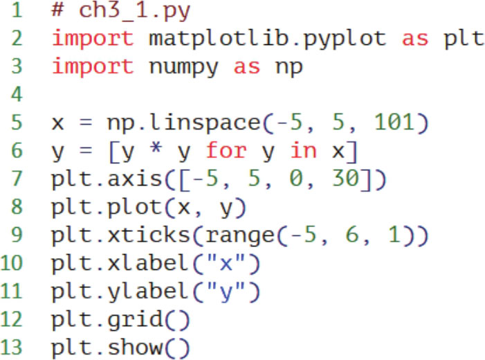 程序实例ch3_1.py: 绘制一条 x -5 5 区间的下列二次函数: