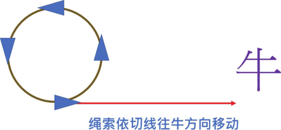 对于弧形运动的物体,是依照弧形某点的切线移动,例如:我们常看到西班牙斗牛,斗牛士想用绳索做的线圈套住牛,当线圈在上方盘旋时,在放手瞬间必须控制线圈切线往牛的方向前进,这样才可以套住牛。