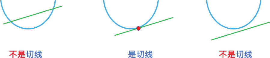 切线 的英文是 tangent line , tangent 在拉丁文中意义是 to touch 。在几何学中,所谓的 切线 是指一条刚好碰触或称切过曲线上一点的线,也就是切线与曲线只有一个交点。