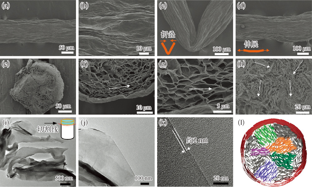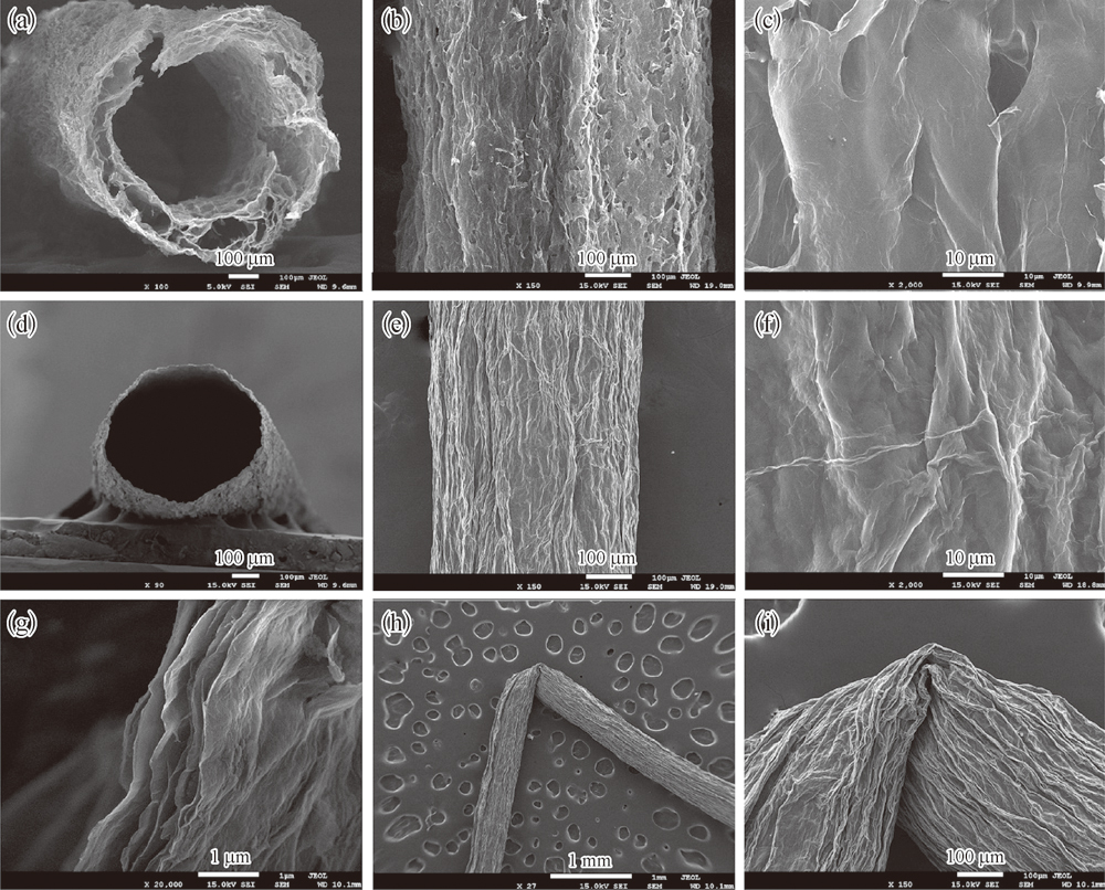 图3-8 液晶湿法纺丝制备的石墨烯纤维表面与截面的典型结构 [16]