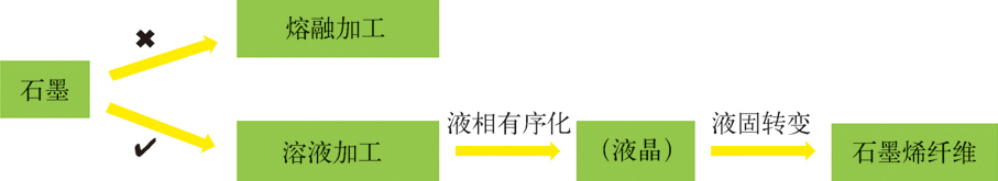 石墨烯不可熔融加工,因此石墨烯纤维的制备只能采用基于液相的方法。在高分子纤维及碳纳米管纤维等传统材料的液相组装过程中,分子链之间的缠结有助于纤维的连续收集,而对于石墨烯纤维的组装来说,液相有序化成为关键 [10] 。氧化石墨烯液晶的发现,为石墨烯的液相有序化和固相有序化材料的制备奠定了基础。基于氧化石墨烯液晶,通过传统的湿法纺丝可实现石墨烯纤维的连续制备,这一方法也被称为液晶湿法纺丝 [11] ,这是目前使用最广泛的石墨烯纤维的制备方法,具有操作简单、连续性好、效率高、易放大等优点。石墨烯加工的路径选择示意图如图3-2所示。