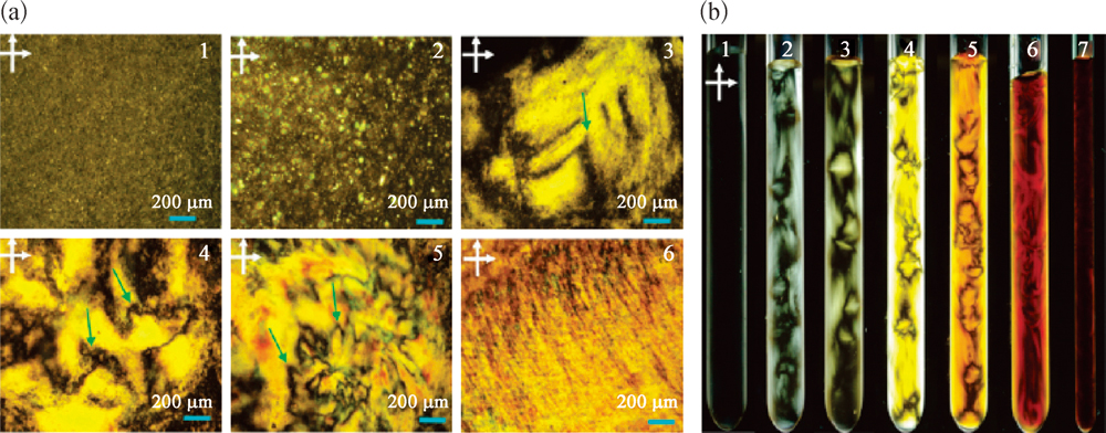 石墨烯溶致液晶是实现石墨烯有序宏观组装的基础,也是连通单层石墨烯优越性能和宏观材料高性能化的桥梁。从胶体液晶经典理论推断,当二维胶体的分散体积分数达到4 d/w ( d 和 w 分别为二维粒子的厚度和宽度)时就可能形成向列相液晶 [12,13] 。石墨烯通常具有结构不对称性,即大的宽厚比,按照液晶理论预测,只需要满足良好分散度的要求,石墨烯应该就可以在分散体系中形成液晶。对于超声剥离的少层石墨烯而言,由于分散液中石墨烯浓度低于1mg/mL,限制了其形成液晶。后来受到碳纳米管液晶的启发,Behabtu等 [14] 利用氯磺酸强质子酸的作用,将石墨剥离成单层或者少层石墨烯,达到2mg/mL的高浓度状态,在偏光显微镜下呈现出典型的向列型液晶织构。但是由于溶剂的环境不友好及剥离效率低等因素,这种方法几乎没有后续尝试。氧化石墨烯作为石墨烯重要的前驱体,具有良好的双亲型,可以在众多溶剂中良好分散,且与超声剥离的石墨烯相比,氧化石墨烯具有更大的宽厚比,因此理论上氧化石墨烯液晶是存在的。