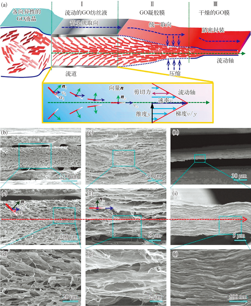 氧化石墨烯液晶不同区域间的取向结构是无规的,类似于“粉末晶体”的结构。利用液晶对外场的响应可以实现对氧化石墨烯液晶取向结构的调节控制。Shen等 [17] 对薄层氧化石墨烯液晶施加电场,发现能够改变氧化石墨烯的排列取向(图3-5)。当对浓度较低的氧化石墨烯施加电压,氧化石墨烯排列取向,可以观察到均匀的液晶现象,即使撤掉电压,取向结构仍能保留。Lin等 [18] 对少层石墨烯施加强磁场,成功诱导石墨烯片沿着磁场方向进行排列(图3-6)。他们对比了少层石墨烯、多层石墨烯的 N -甲基吡咯烷酮分散液在强磁场中的响应,由于少层石墨烯片的抗磁性为0.31×10 -4 (emu/g)/Oe,多层石墨烯的抗磁性为0.23×10 -4 (emu/g)/Oe,因此少层石墨烯在强磁场中的响应更大。流动场控制取向在液晶湿纺过程中尤为重要,是实现石墨烯纤维有序结构的重要因素。Liu等 [19] 在湿法纺膜时,记录分析了氧化石墨烯液晶在流道中的取向过程,如图3-7所示。从不同阶段的SEM图中可以看出,在剪切流动场作用下,氧化石墨烯液晶逐渐沿着喷膜孔平面完成取向。