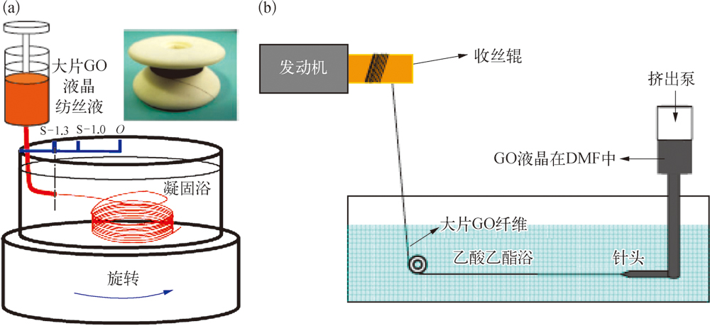 氧化石墨烯液晶的发现解决了氧化石墨烯液相的有序性,但如何实现由液相有序向固相有序转变,得到具有有序结构的宏观组装体成为一大研究难题。高超课题组 [16] 在首次发现氧化石墨烯溶致液晶现象后,继续深入探索,并借鉴高分子湿法纺丝方法,将高浓度(57mg/mL)的氧化石墨烯液晶注射到旋转的氢氧化钠/甲醇或者氯化钙/乙醇等强凝固体系中,在流场和凝固场的共同作用下形成凝胶纤维,再依次经过水洗、干燥、还原等步骤,最终收集到长度达数米的石墨烯纤维(图3-8)。