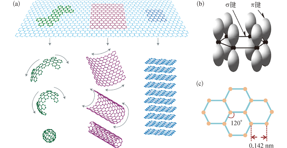 理想的单层石墨烯是由sp 2 杂化碳原子共价键连接形成的蜂窝状二维平面结构。sp 2 杂化碳原子在面内形成σ键,面外形成π键[图1-1(b)]。其中,三个σ键彼此等效形成120°的夹角,碳碳键的键长为0.142nm[图1-1(c)]。共平面的大π键体系使得弱局域化的π电子可以在平面内相邻碳原子间自由跳跃。石墨烯的化学结构及其独特的二维拓扑特性赋予了其优异的力学、电学、光学、热学等特性。