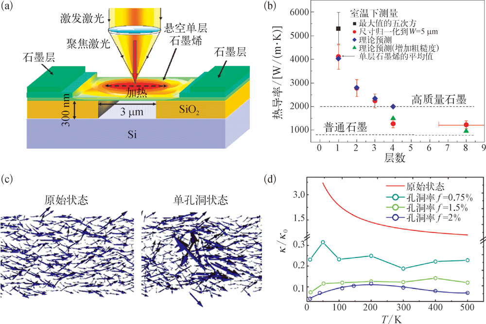 (a)测量方法示意图;(b)石墨烯及石墨的热导率对比;(c)石墨烯声子在缺陷处传递方向;(d)缺陷对石墨烯热导率的影响