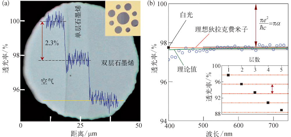 对石墨烯在太赫兹(terahertz, THz)波段的光吸收光谱进行分析,发现其吸收与频率存在近似Drude模型的关系。通过对石墨烯电子费米能级的调控,可以改变石墨烯的透光率。实验还发现,石墨烯的透光率会随着层数增加而减少,这为石墨烯厚度的光学分辨提供了便利