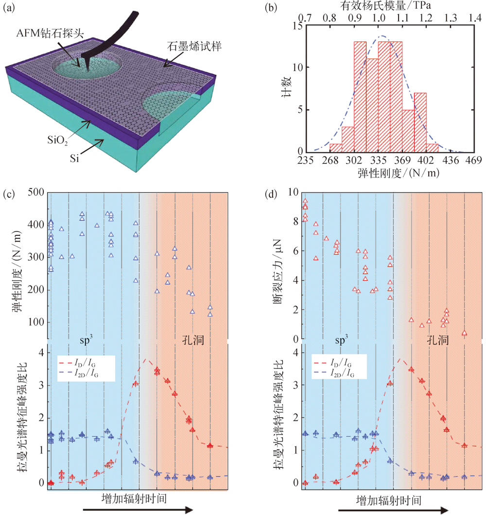 (a)测量方法示意图;(b)完美单层石墨烯的杨氏模量;(c)弹性刚度与石墨烯缺陷的关系;(d)断裂应力与石墨烯缺陷的关系