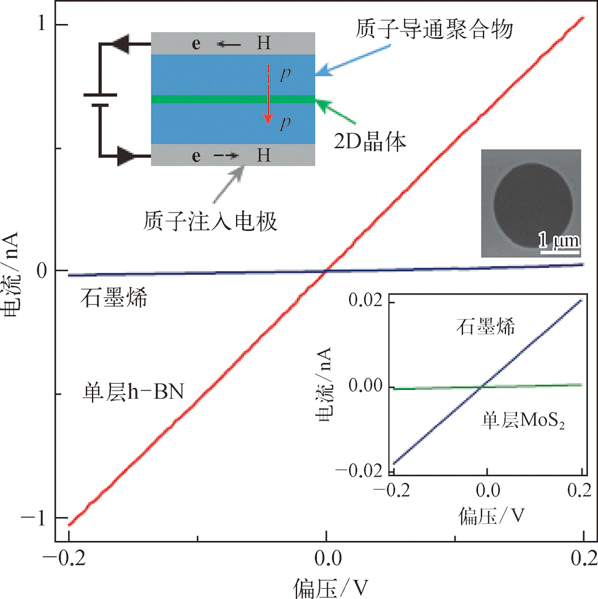 2014年,Geim课题组 [16] 首次发现了质子可以有效地穿过包括石墨烯在内的一些原子晶体,同时阻止氢气、水等小分子的穿过(图1-6)。这一发现表明石墨烯可以用于隔膜材料的设计及研究质子的传输行为。