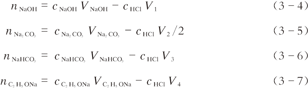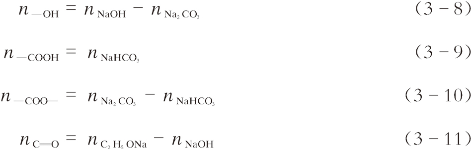 式中, c NaOH 、 c Na2 CO 3 、 c NaHCO3 、 c C2 H 5 ONa分别为各标准碱液的物质的量浓度; V NaOH 、 V Na2 CO 3 、 V NaHCO3 、 V C2 H 5 ONa分别为溶解氧化石墨烯所用的各标准碱液的体积。则氧化石墨烯表面不同含氧官能团的含量可以用式(3-8)~(3-11)计算: