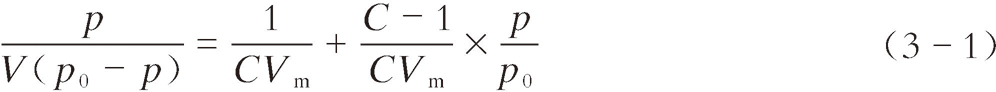 式中, p 为吸附质分压,Pa; p 0 为吸附剂饱和蒸气压,Pa; V 为对应压力下气体吸附量,cm 3 ; V m 为单层饱和吸附量,cm 3 ; C 为与吸附热相关的常数。