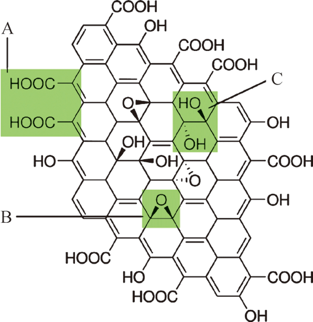 图3-27 氧化石墨烯表面官能团示意图A—羧基;B—酯基或羰基;C—羟基