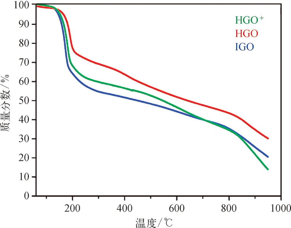HGO + —改性的Hummers法制备的氧化石墨烯;HGO—Hummers法制备的氧化石墨烯;IGO—优化方法制备的氧化石墨烯