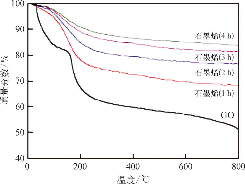 与氧化石墨烯不同,石墨烯的热重曲线一般仅有一个台阶(图3-26)。这主要是由于石墨烯中含氧官能团的数量远小于氧化石墨烯,热稳定性较高,同时羟基和羧基等含氧官能团的明显减少也会引起石墨烯吸水率的下降,因此在热重曲线上表现为水分子的失去并不明显。