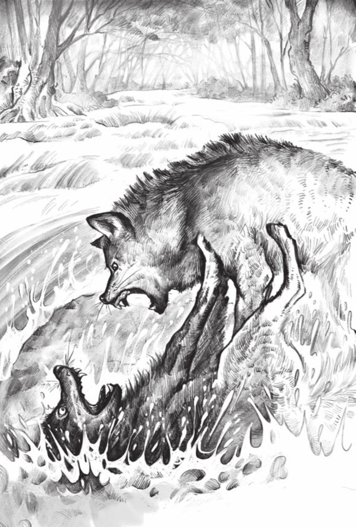 肉陀是古戛纳狼群中出类拔萃的大公狼,上半身毛色焦黑如炭,下半身毛色洁白如雪,集黑夜恐怖与冰雪冷酷于一身。这家伙肩胛上长着鹅蛋大小的一块疙瘩肉,活像瘤牛隆起的鬐甲,这一生理特征使它得了“肉陀”这么个奇怪的名字。它的身躯比普通草狼要高出半个肩胛,同灰满不相上下。灰满和肉陀同年出生,各有各的绝活。灰满善扑,曾从几丈高的山崖上扑倒过一只藏在绝壁间的岩羊;肉陀善咬,曾一口咬断一头疾跑中的公鹿的喉管。老狼酋波波还在世时,灰满和肉陀就是古戛纳狼群中并驾齐驱、平分秋色的双杰。个体雄性之间社会地位越接近,其紧张度就越高,灰满和肉陀当然也就不可能和睦相处,都恨不得一口把对方吞了,但有狼酋波波管束,谁也没敢轻举妄动。波波一死,恶斗立即开始。谁都想自己去填补波波留下的狼酋空缺,谁都想把对方踩到脚底下。好险哪,灰满虽然体格、胆魄和争夺高位的意志都不亚于肉陀,但那时它已经断了一只前爪,扑咬起来到底受点影响,在肉陀凌厉的攻势下,差点就被咬翻了。它和肉陀在古戛纳河西岸边展开了恶斗,那段河岸的地势特别险峻,没有平缓的金沙滩,而是怪石陡立,水流湍急。它的腿弯和脖子已被咬伤,流着血,在河岸的怪石间且战且退。眼看做狼酋的美梦就要破碎,突然,发生了意外——肉陀取胜心切,穷凶极恶地连续扑咬,不料最后一下没扑准,踩在一块长满青苔的圆石上,咕咚一声滑进河去。狼不是两栖动物,狼是陆上猛兽,不谙水性,不善泅泳。河水又深又急,水面还旋着涡纹。肉陀在水里吃力地划动四肢,企图爬上岸来。灰满才不是那种会给对手喘息机会的大傻瓜。两雄相斗,没有君子。它赶到肉陀企图登岸的地方,以逸待劳地守着,等到肉陀的上半个身体好不容易攀上岸来时,它照着那只水淋淋的狼头毫不客气地就是一口。肉陀立足未稳,为了躲过致命的噬咬,不得不松开爪子跌回河里去。形势发生了戏剧性的逆转,灰满占尽上风,轻松得就跟玩儿似的。肉陀在河里泡了三五回,野心泡湿了,傲骨泡酥了,威风泡没了,灌了一肚子凉水,再也没有胃口来争勇斗狠了。它终于像条死狗似的趴在河边的一块卵石上,呜嗬呜嗬地朝灰满发出求饶的哀嗥。