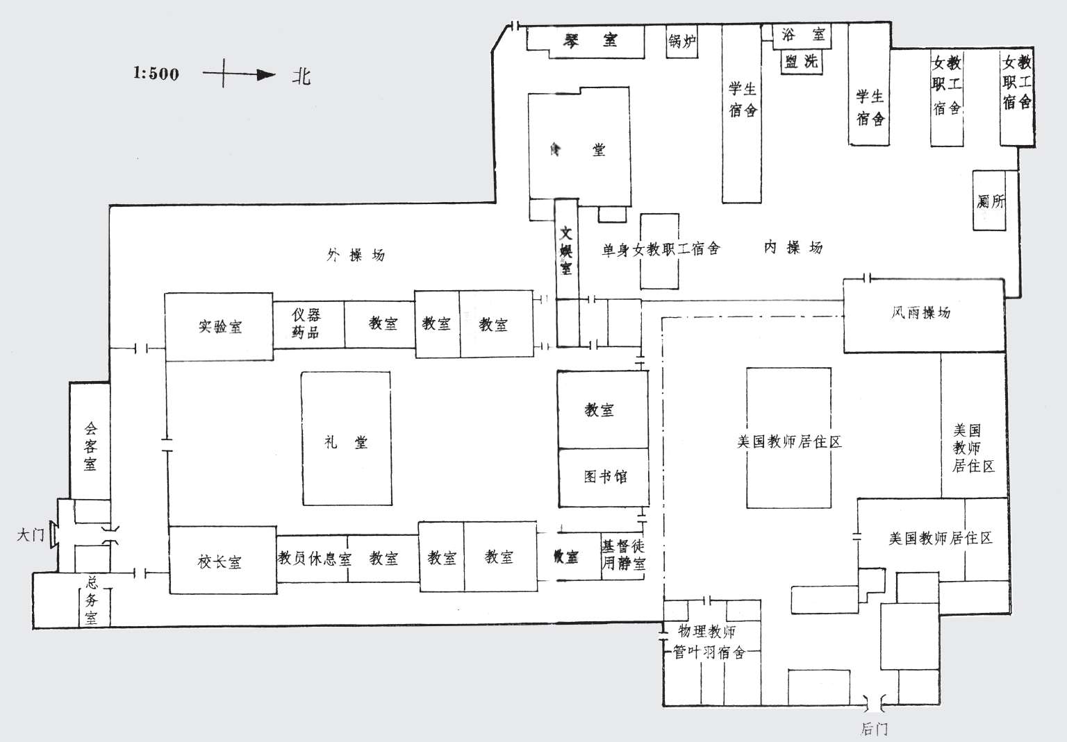 这样的“大学”的空间结构耐人寻味,它是一个封闭的、自成一统的小天地,和中国传统书院的物理形态(图9)相去不远。1916年,在全国广泛招生的国立北京大学已经有一千五百零三名学生,1920年便实现了男女同校,而迁校之前的燕大学生大多还来自各地基督徒家庭,男女分校,只有女生偶尔到男校上课。1919年,当著名的红楼已经落成三年时,燕大的年轻人还像在一个宗教机构里面修行;不像国立北京大学的学生大多走读,学生中已经结婚生子的也不在少数。燕大的学生很多是十八九岁的青春少年,生活、学习在一起。(图10)他们的“大学”生活,从教务处到实验室,从食堂到浴室,紧密地安排在局促的数十间平房里:
