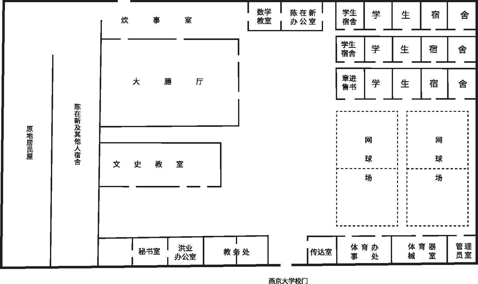 图7 燕大盔甲厂四院分布略图(据陈允敦老校友回忆草图)。作者根据《燕京大学史稿》附录重绘