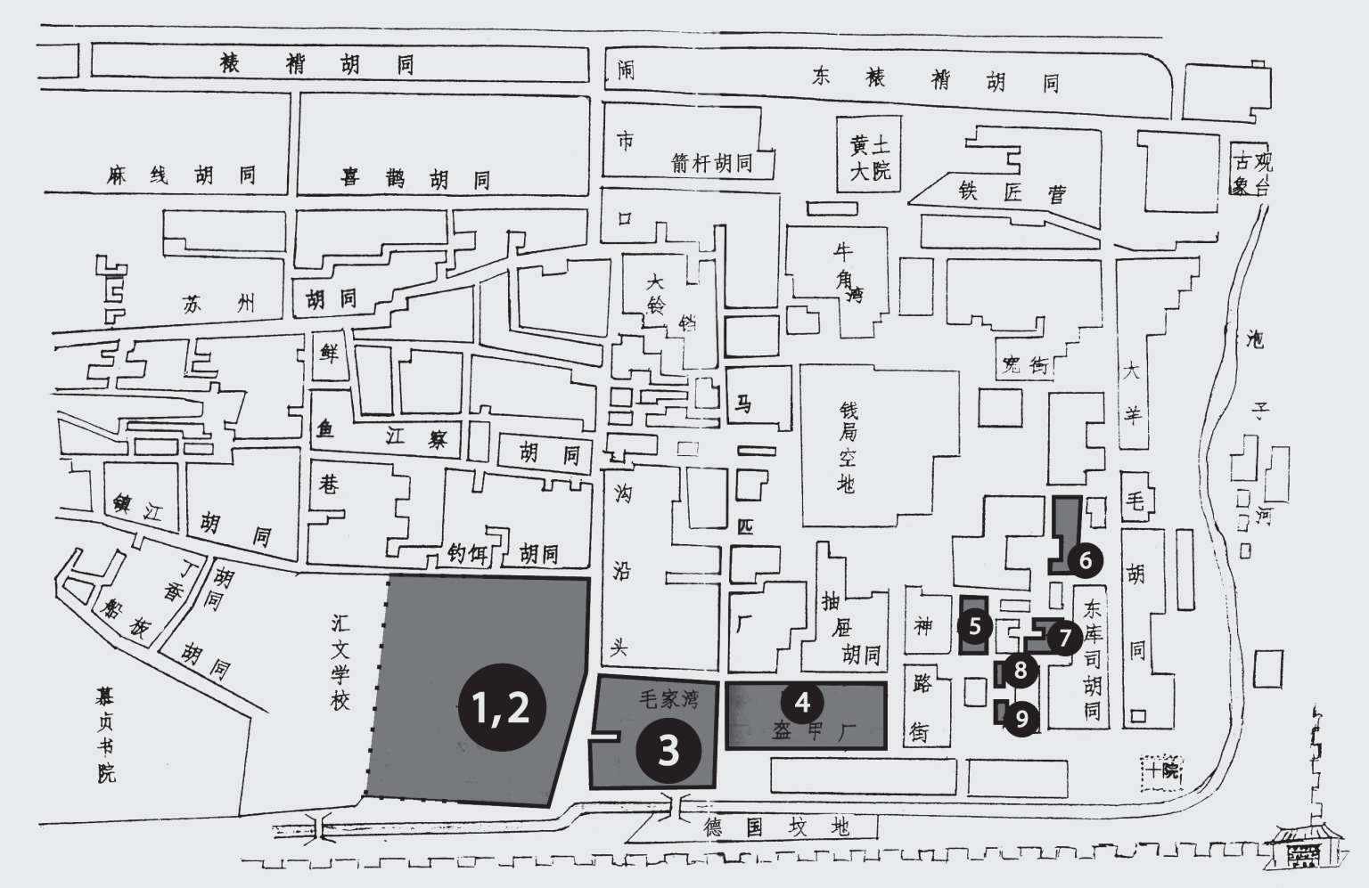 图6 燕大盔甲厂校址各院分布略图。图中数字序号为作者所加