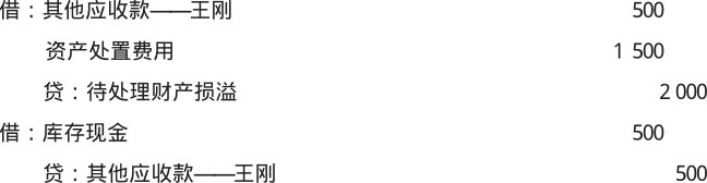 【例1-9】某单位出纳人员在当日结账时发现现金短缺2 000元,由于无法查清短款原因,报经批准后,由责任人王刚赔偿500元(已赔偿),其余短款计入当期费用。该单位应做如下会计分录。