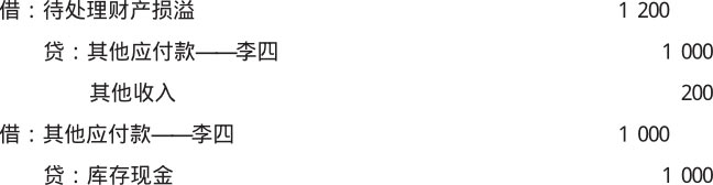 【例1-8】某单位出纳人员在当日结账时发现现金溢余1 200元,经调查发现其中1 000元是属于应支付给内部职员李四的(已支付),剩余金额无法查明原因,报经批准后计入其他收入。该单位应做如下会计分录。