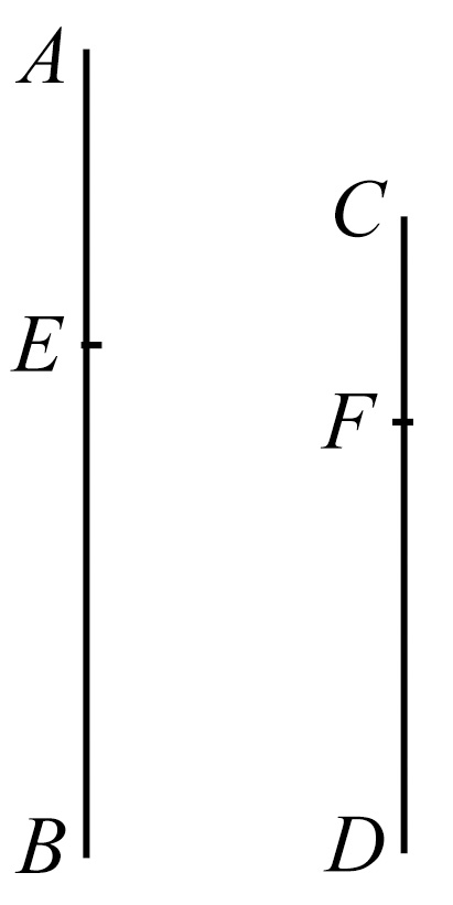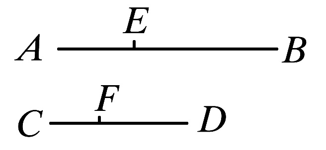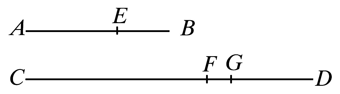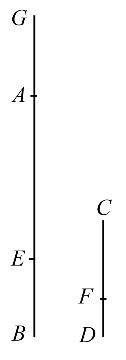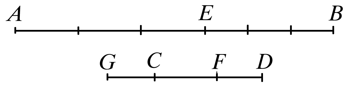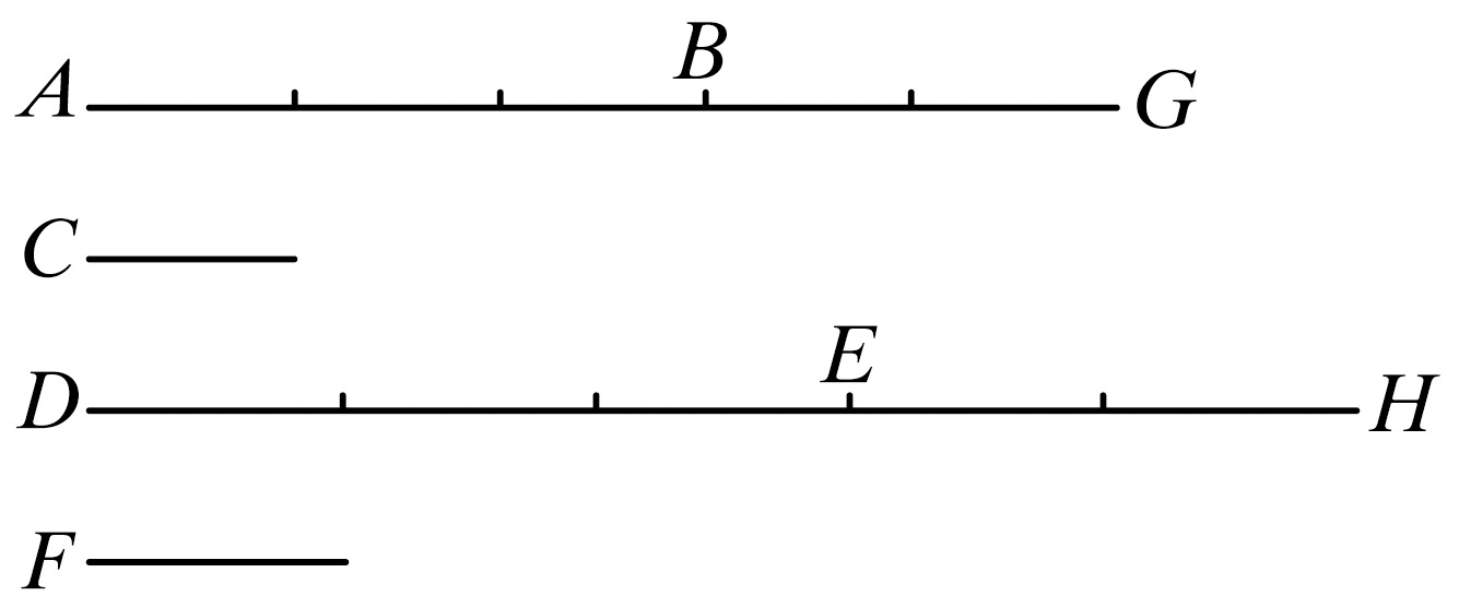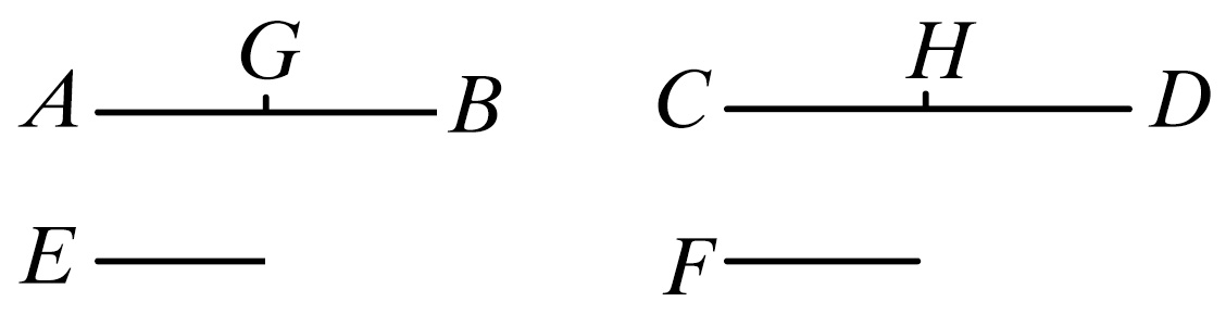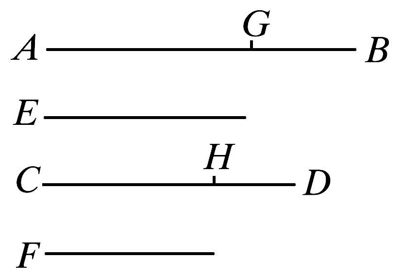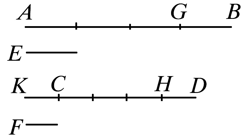 设AB被分成等于E的量AG、GB,并且CD被分成等于F的量CH、HD.那么,量AG、GB的个数等于量CH、HD的个数。