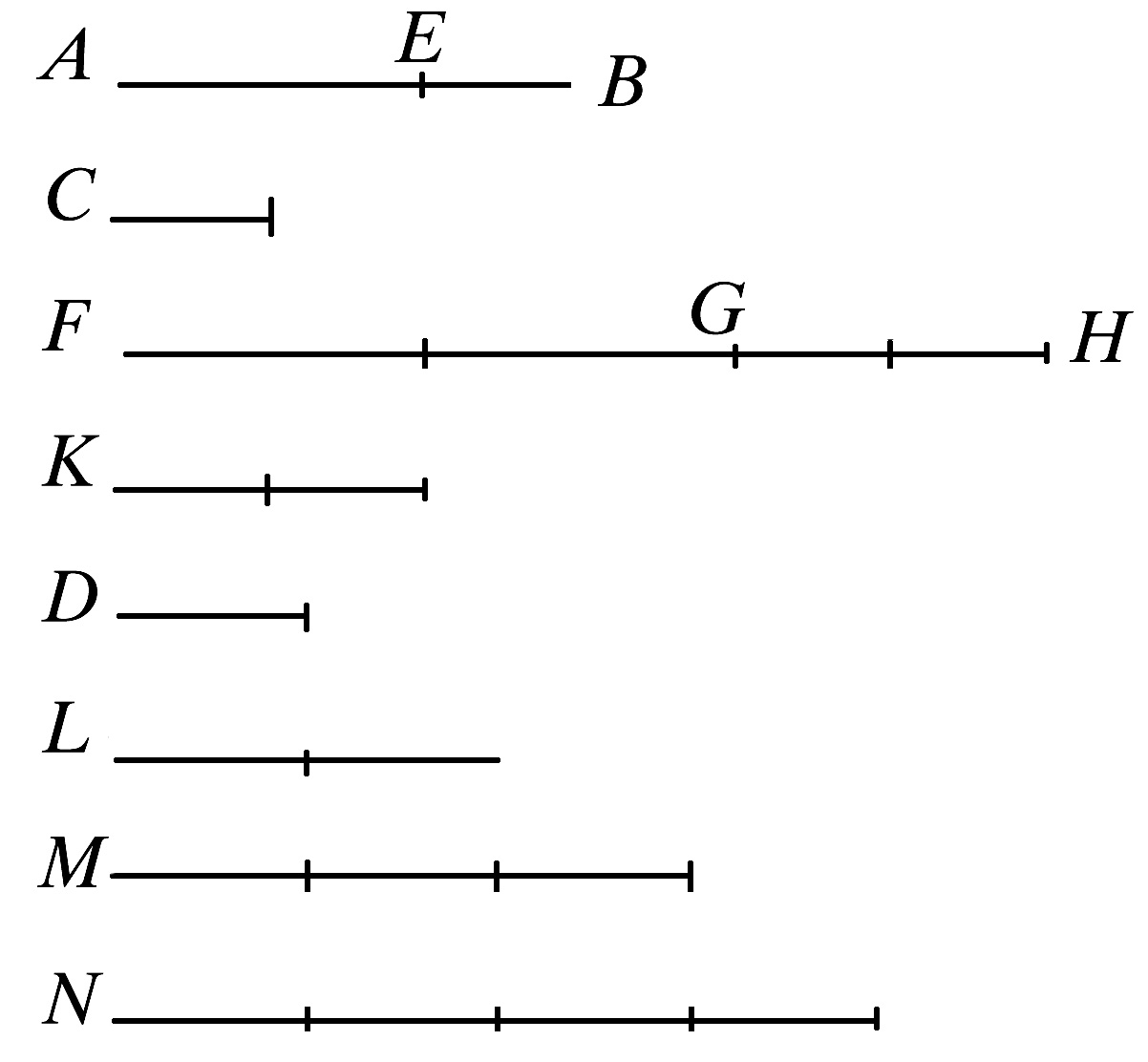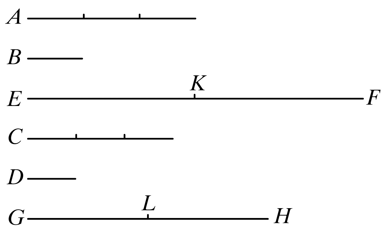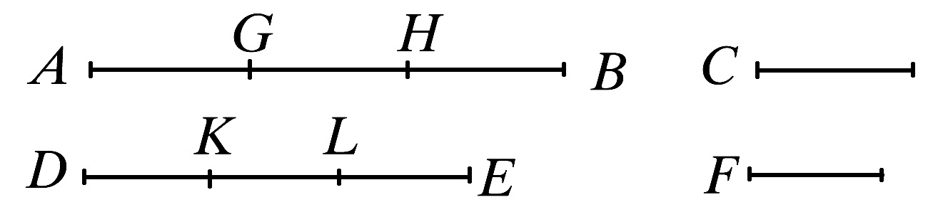 “由此显然可知,如果任意个量AB,BG,GH是另一个量C的倍数,并且同个数的量DE,EK,KL分别是F的相同倍数,则前面量的总和AH关于C的倍数与后面量的总和DL关于F的倍数相同。”