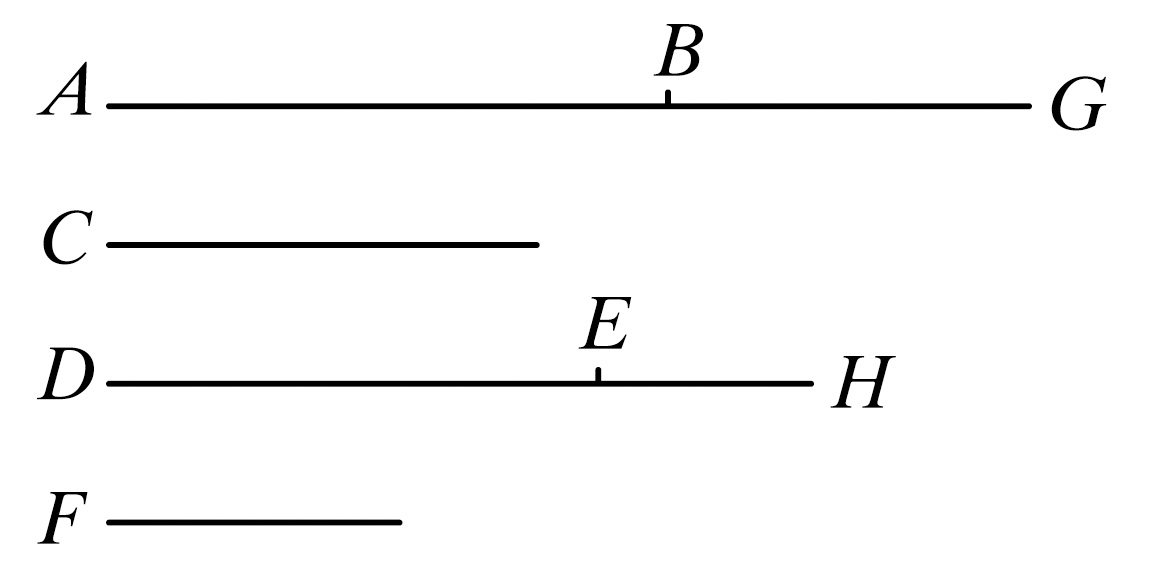 设第一量A是第二量B的倍量,第三量C是第四量D的倍量,其倍数相等。又取定A,C的等倍量EF,GH.