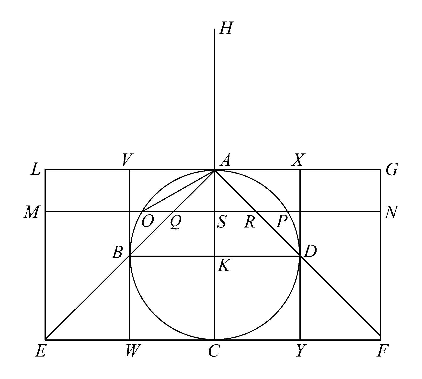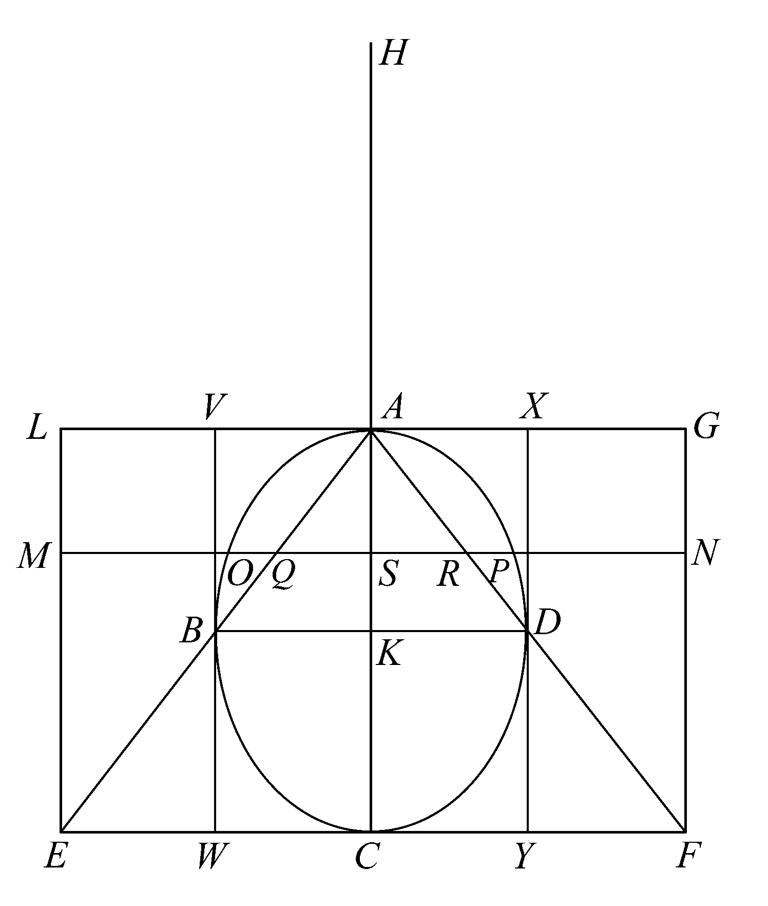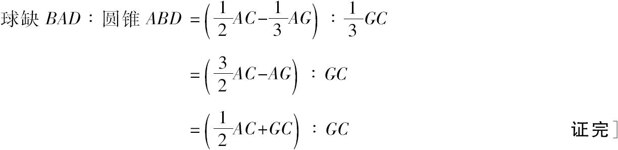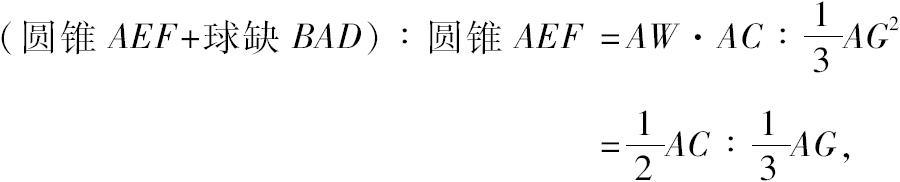 在与AC垂直的平面上作以BD为直径的圆,再以该圆为底,以A为顶点作一圆锥,扩展这一圆锥的表面,然后用经过C点平行于该圆锥底的平面去截它,截面是以EF为直径的圆,以该圆为底,以AC为高和轴作一圆柱,并延长CA至H,使AH等于CA.