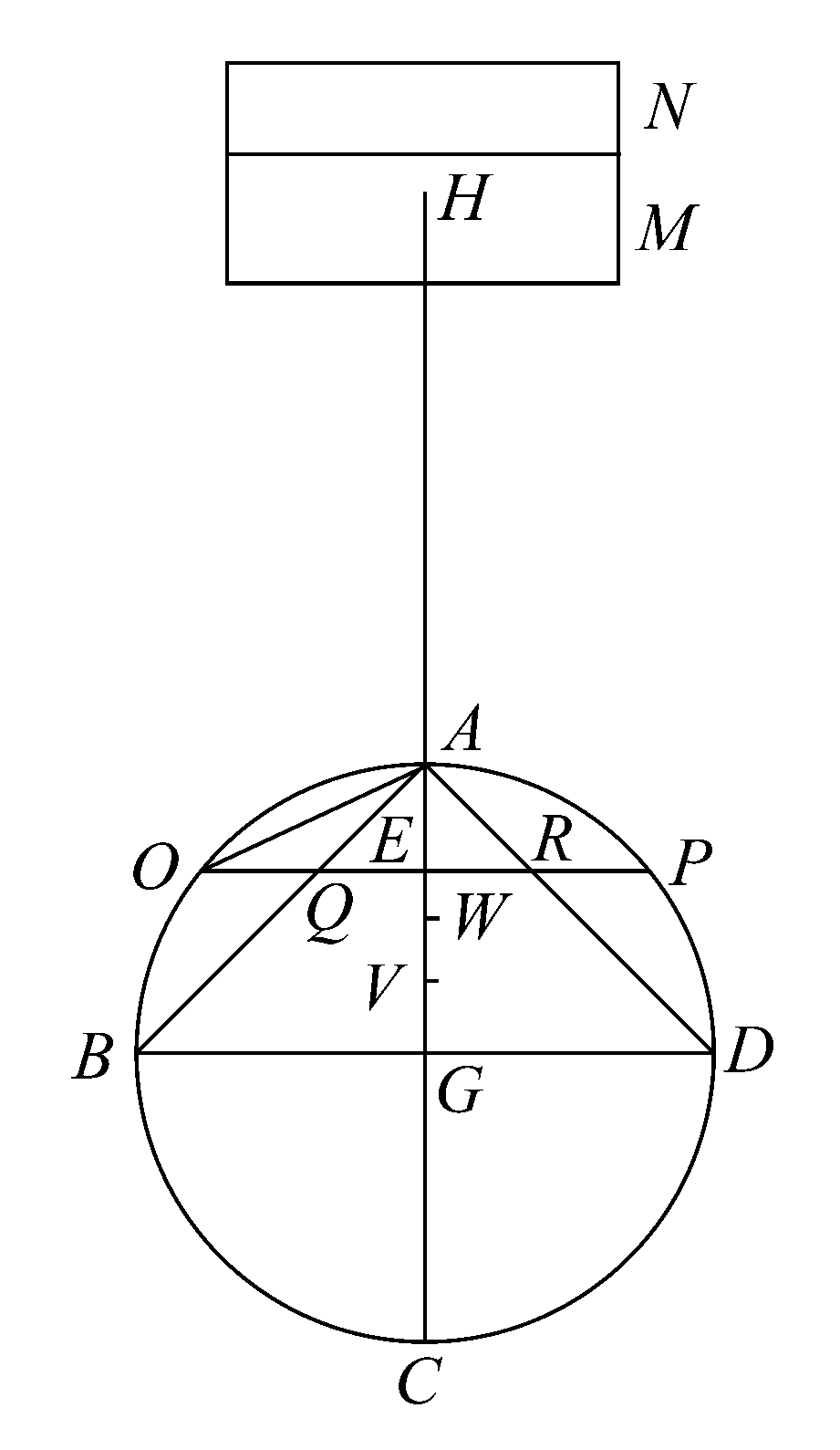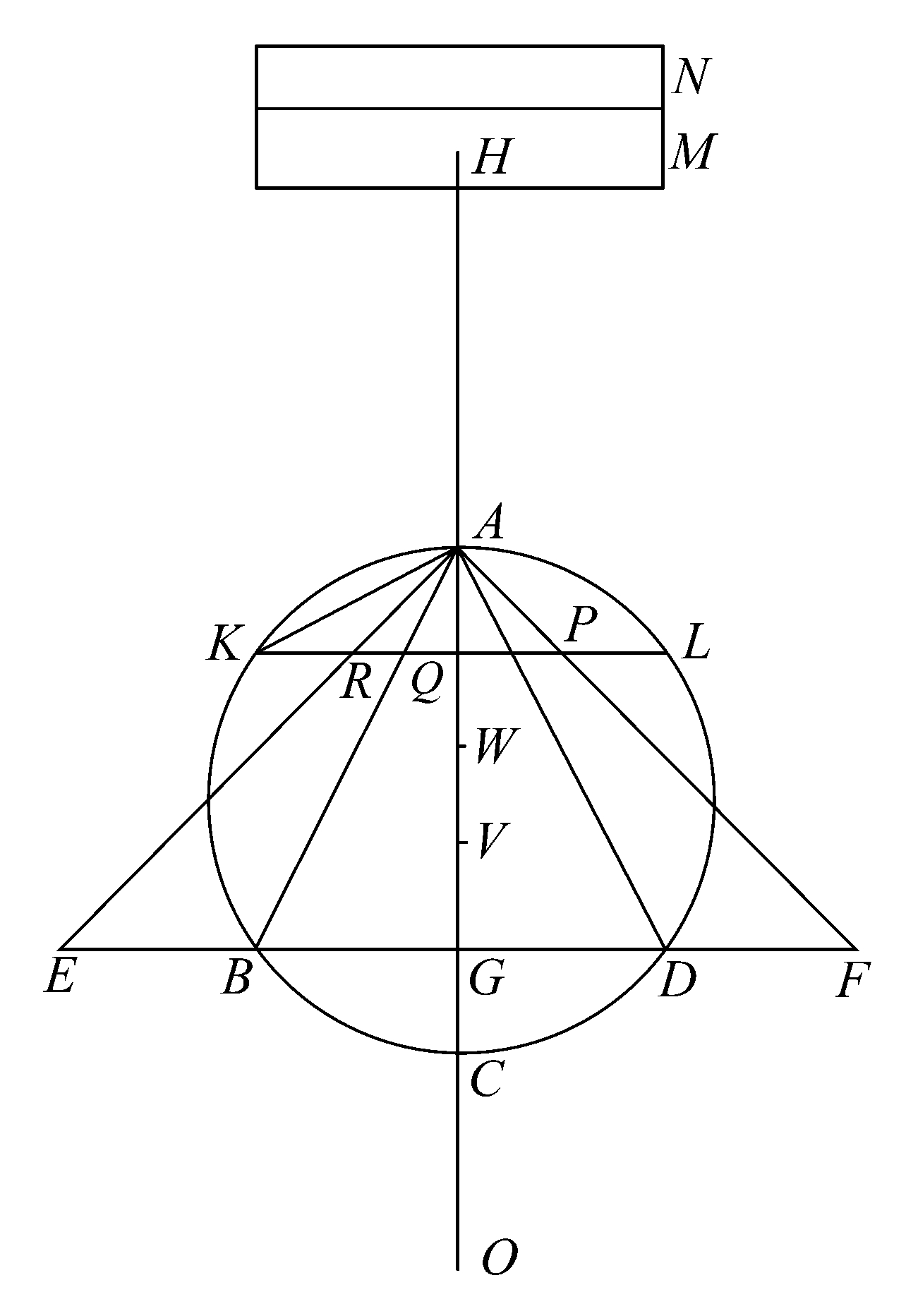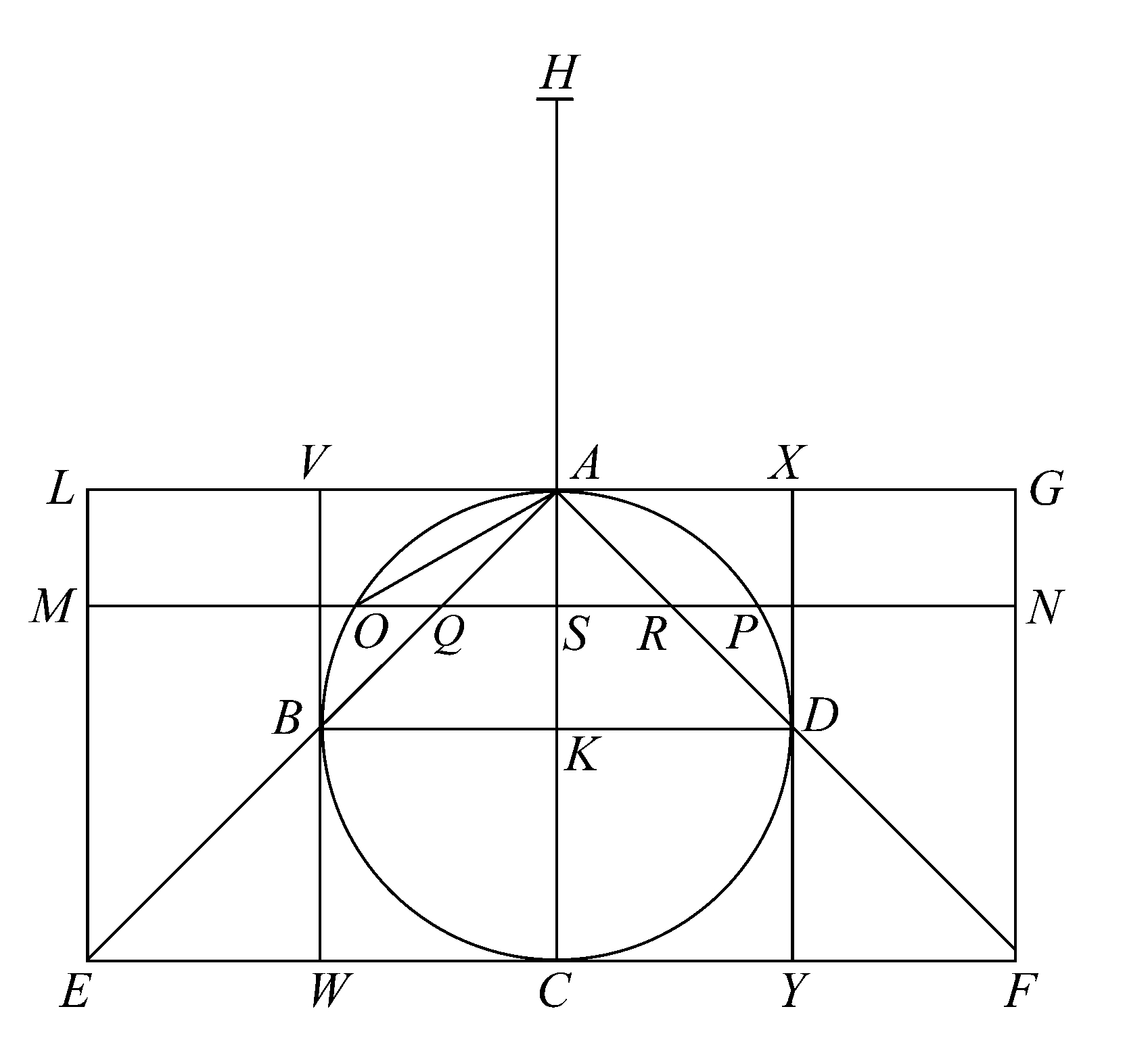 在与AC垂直的平面上作以BD为直径的圆,再以该圆为底,以A为顶点作一圆锥,扩展这一圆锥的表面,然后用经过C点平行于该圆锥底的平面去截它,截面是以EF为直径的圆,以该圆为底,以AC为高和轴作一圆柱,并延长CA至H,使AH等于CA.