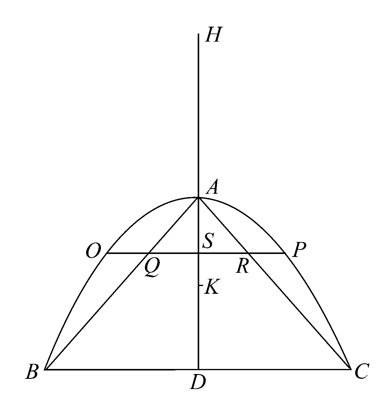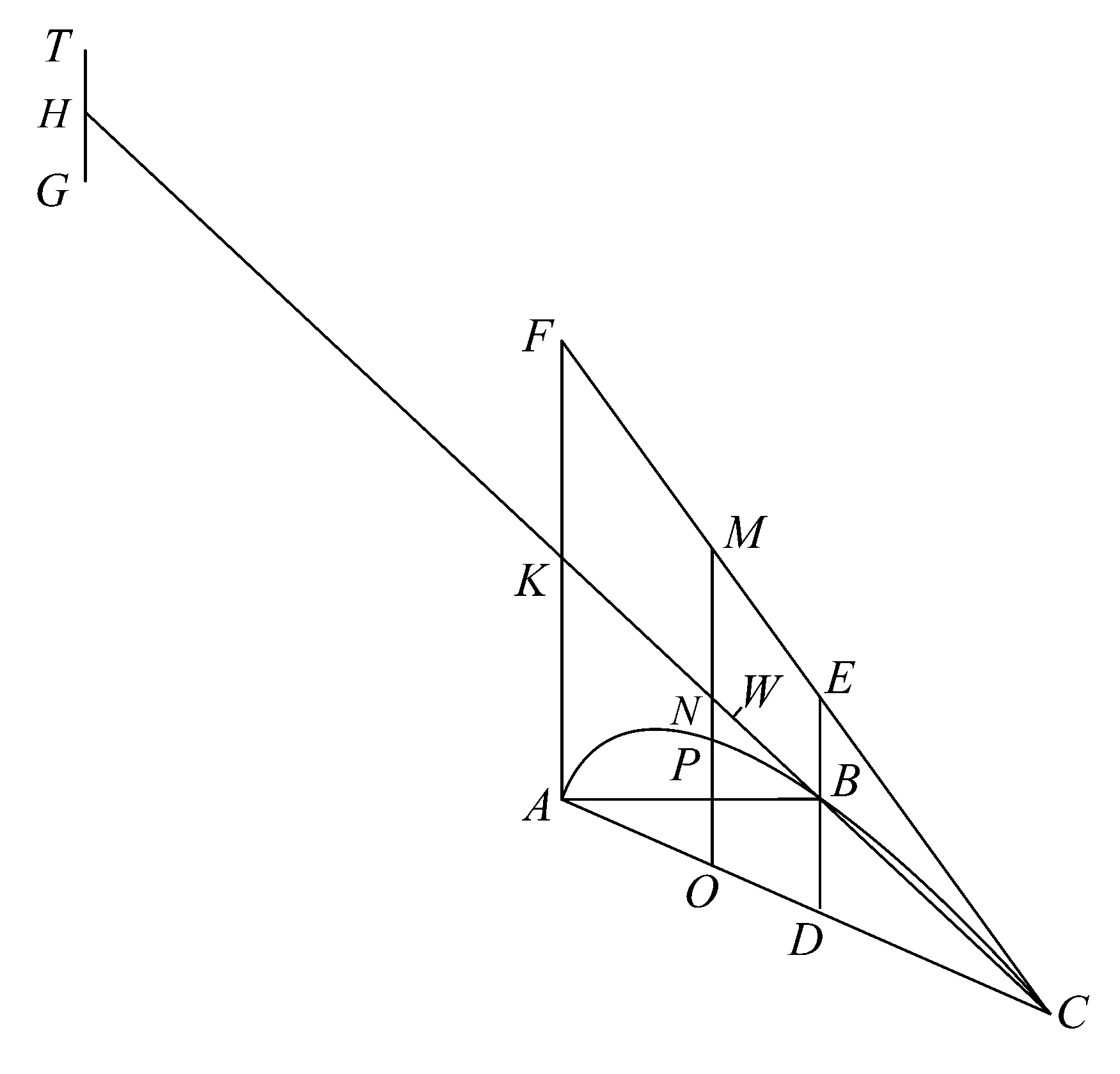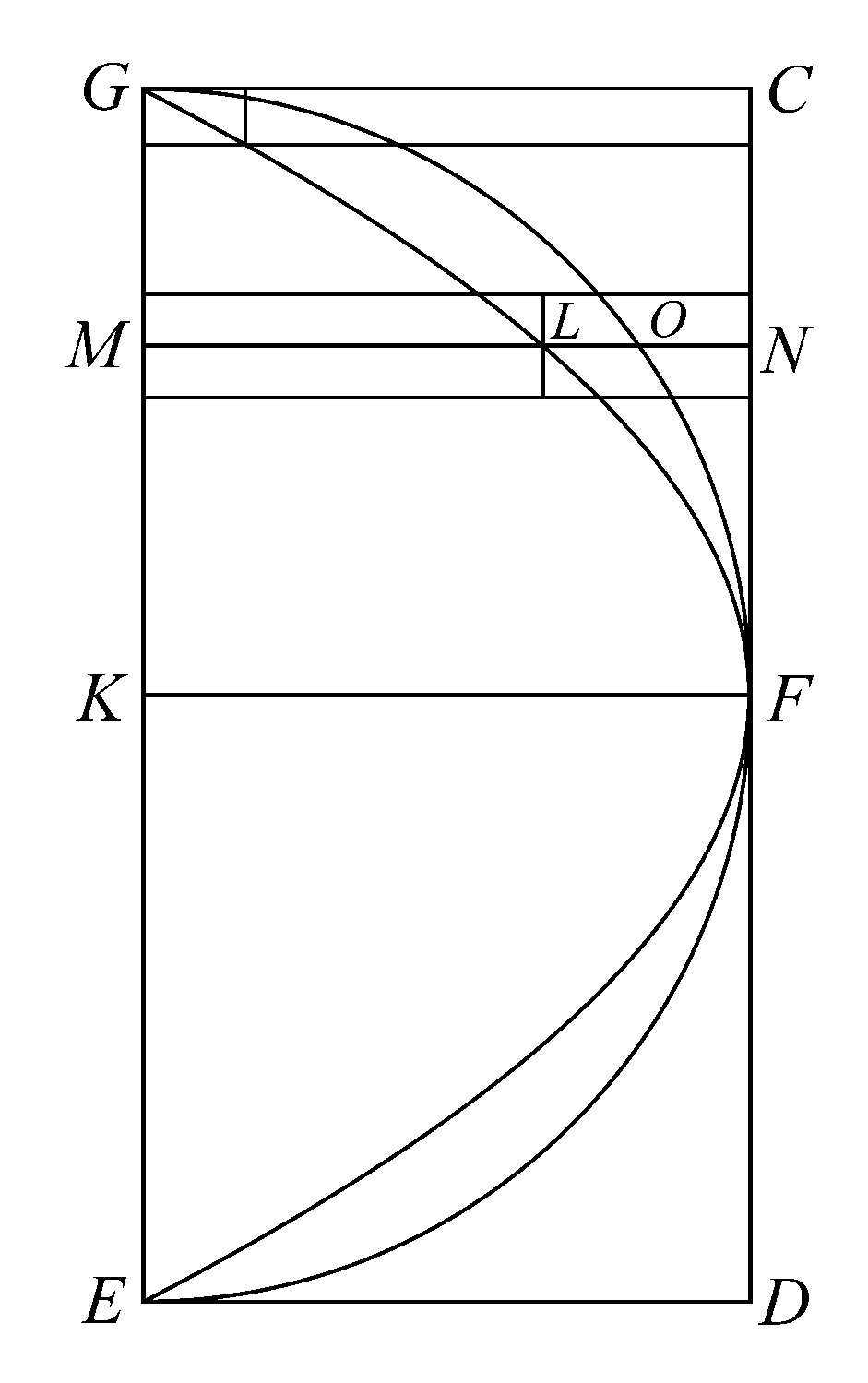 因为三角形CFA由所有像MO一样的平行线组成、弓形CBA由所有像PO一样含于曲线内部的直线组成,所以可推知,置于图中所示位置上的三角形与以H为重心放置的弓形CBA关于K点保持平衡。