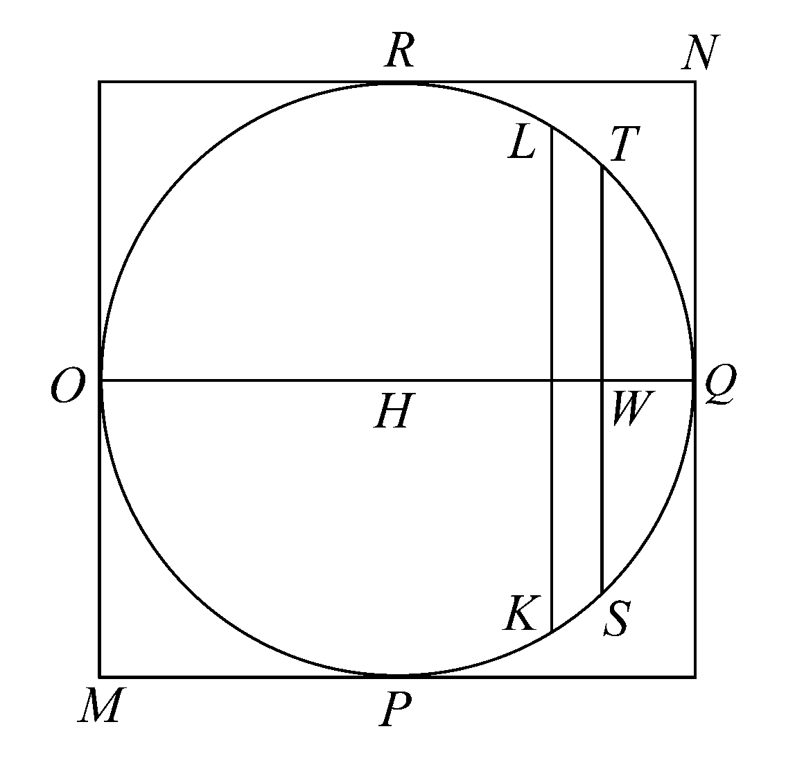 过MN作与AC成直角的平面,该平面截圆柱所得的截面是以MN为直径的圆,截球所得的截面是以OP为直径的圆,截圆锥得以QR为直径的圆。