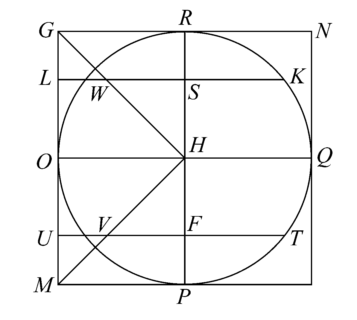 命题15 [该命题已经失传了,这篇论文的序言里曾提到两个特殊的问题,它是对其中的第二个问题所做的力学考察,即用力学方法考察两圆柱间所含图形的体积,其中每个圆柱都内接于同一个立方体,每个圆柱的相对的底面位于立方体的两个相对的面上,并且其表面与立方体的其余四个面相切。