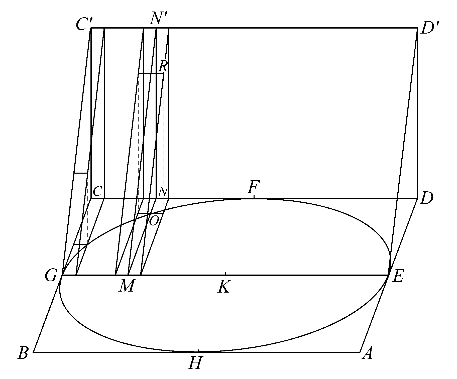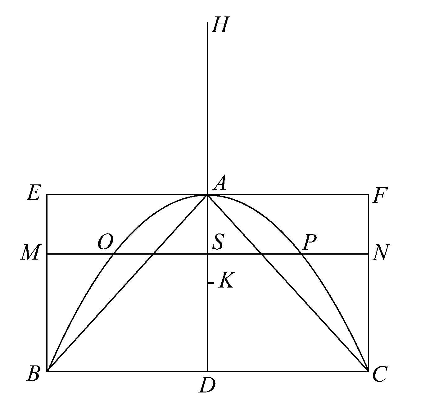 设MO是平行于ED的任一直线,它与CF、CK、AC分别交于点M、N、O,与曲线交于P点。