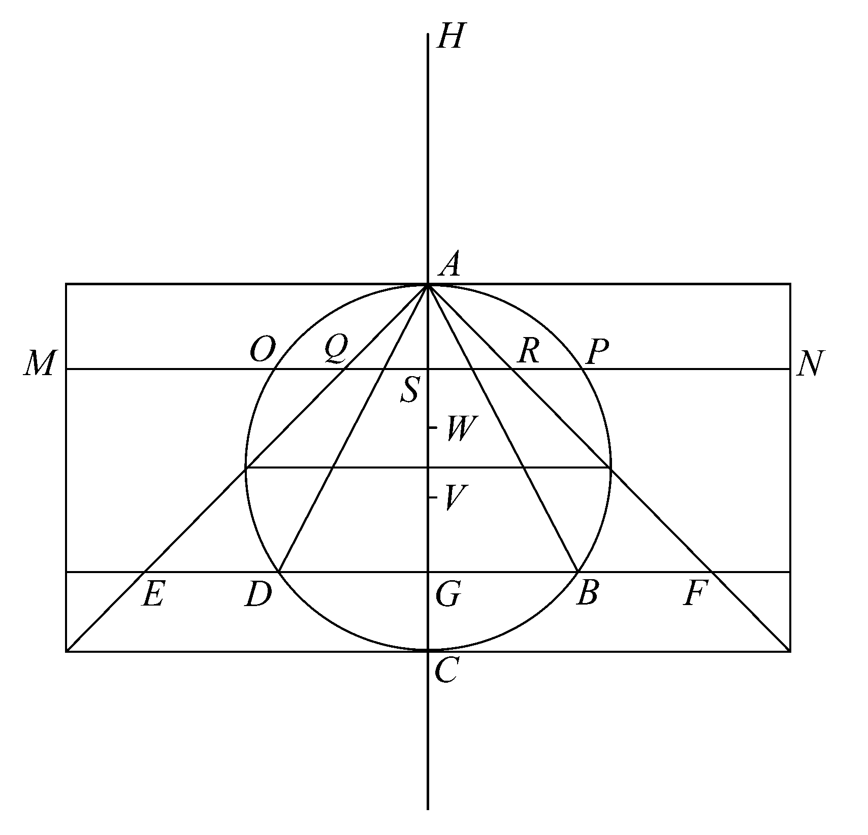 因此,若以H为重心放置球中的圆和圆锥中的圆,那么,处于原位置上的圆柱中的圆与前两圆关于A点保持平衡。
