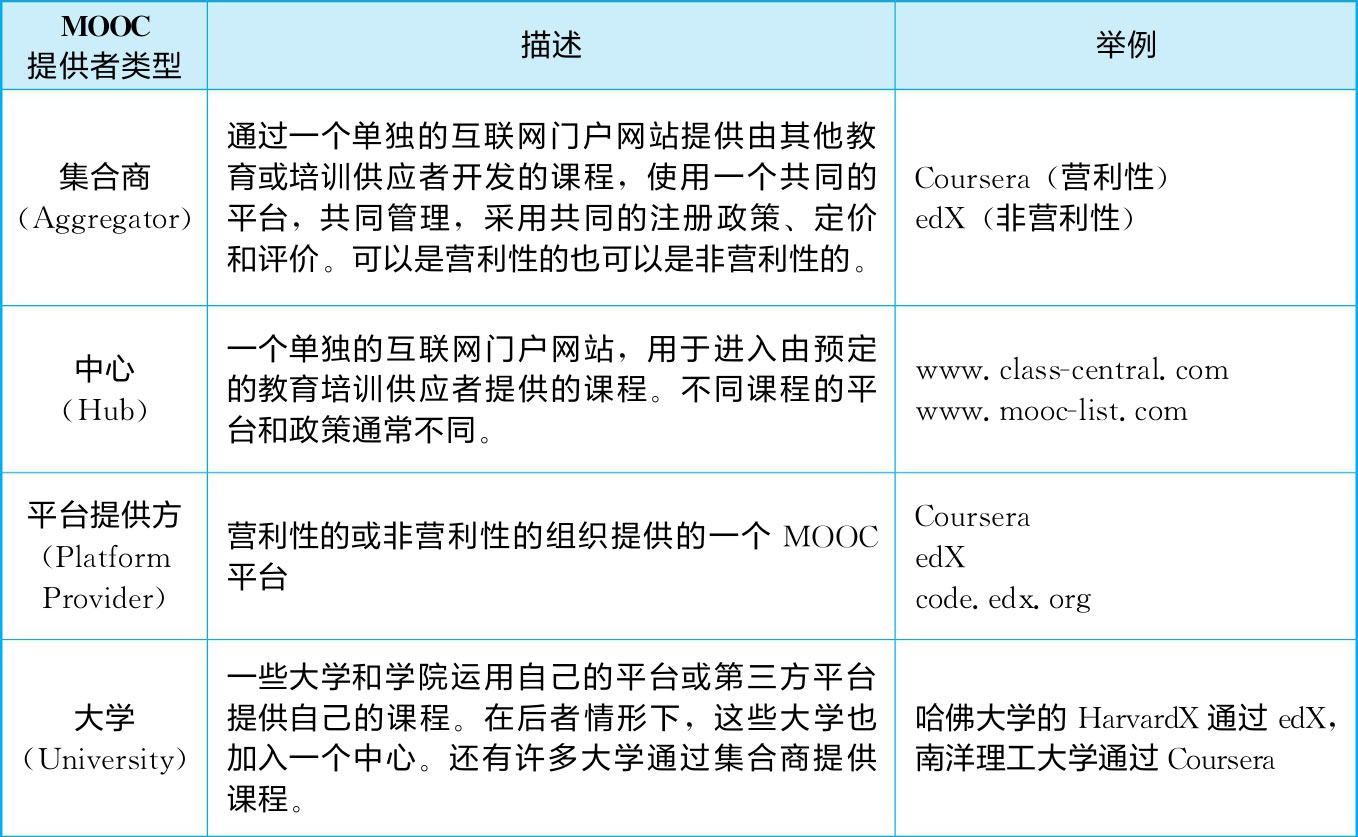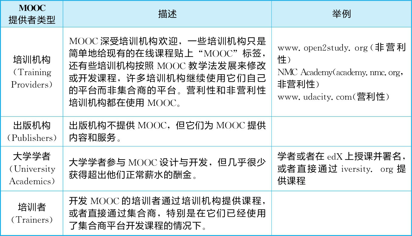 美国本土MOOC开发实践中存在着发挥不同作用的各种类型MOOC提供者,这些类型包括集合商、中心、平台提供方、大学、培训机构、出版机构、大学学者、培训者,不同类型的提供者扮演着不同的角色,发挥着不可替代的作用(见表1-3)。