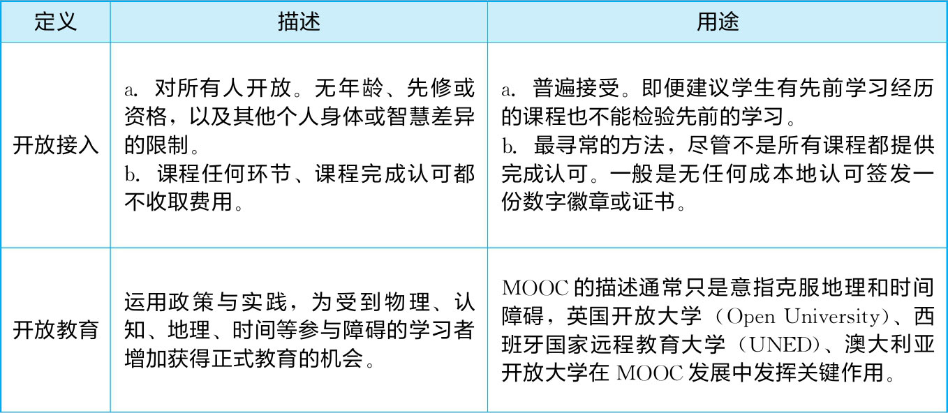 鉴于“开放”之于MOOC所具有的本体性意义,众多学者对“开放”的深刻内涵进行了专门探讨与深入阐发。科洛巴斯(Klobas et al.,2015)从开放接入、开放教育、观念开放、开放日程安排四个层面描述了MOOC开放属性的内涵及用途(见表1-1)。扼要地说,科洛巴斯的讨论主要立足于学习者的立场来展开,突出了学习者的需求,而忽略或缺失了从参与开发提供MOOC的各方主体,特别是MOOC教学设计制作的教师主体立场的讨论,而这一方面,在穆尔德(Mulder,2015)