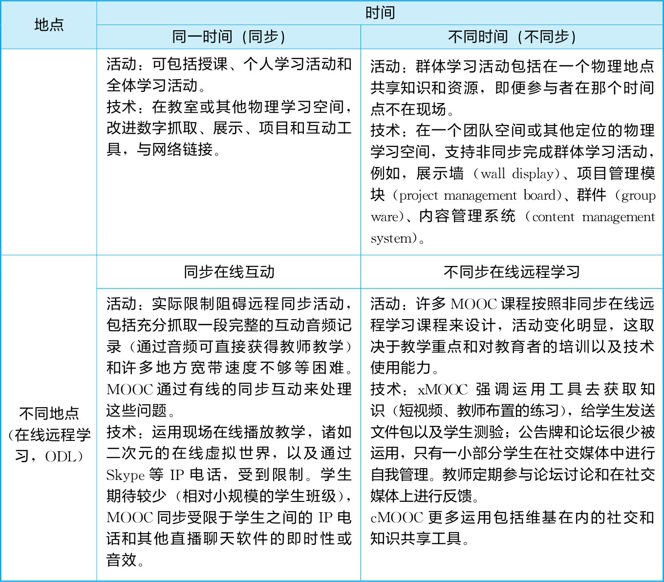 表1-2 学习活动和技术的可能变化:基于MOOC参与的地点与时间