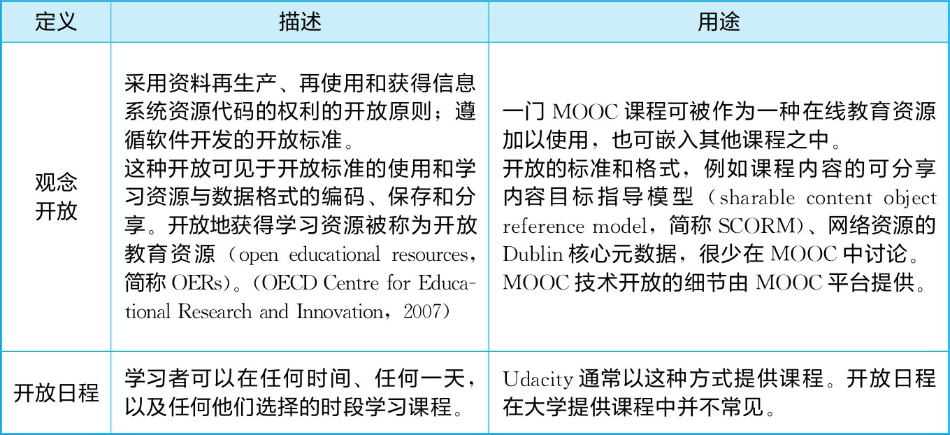 注:1.开放教育或者开放学习,不同于开放教学法。开放教学法是一种用“教育网络”来替代机构学习的学习方法,技术通过学习网络来支持知识交流。2. Udacity是最早的MOOC平台之一,已经将其商业模式转型为在线课程提供者。目前,该平台课程参与收取一定订金(资料下载免费)。