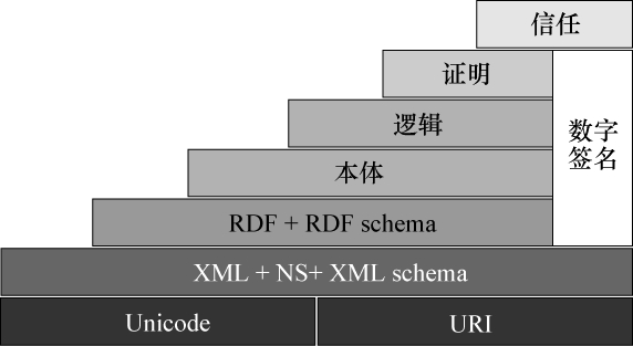(1)Unicode和URI层:这是语义网的基础。在语义网环境中,所有需要描述的事物都被称为资源。Unicode用来定义国际通用字符集,实现资源的统一编码。URI是统一资源标识符(uniform resource identifier),语义网上每一个资源都由唯一的URI来标识。