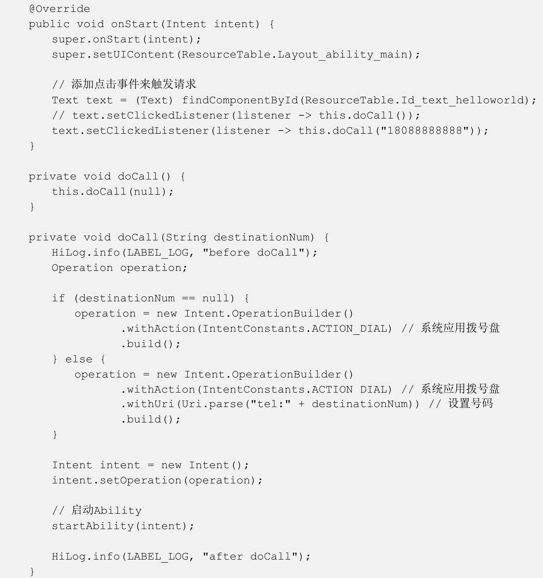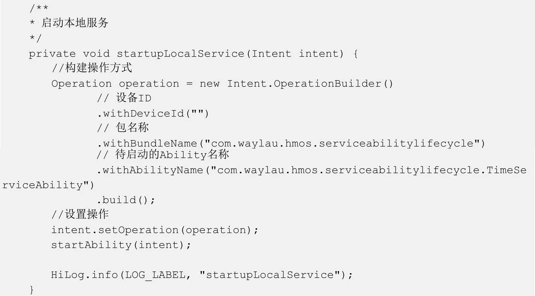 在5.8节的ServiceAbilityLifeCycle应用中,启动本地服务的方式就是根据Ability的全称启动应用的一个例子。其代码如下: