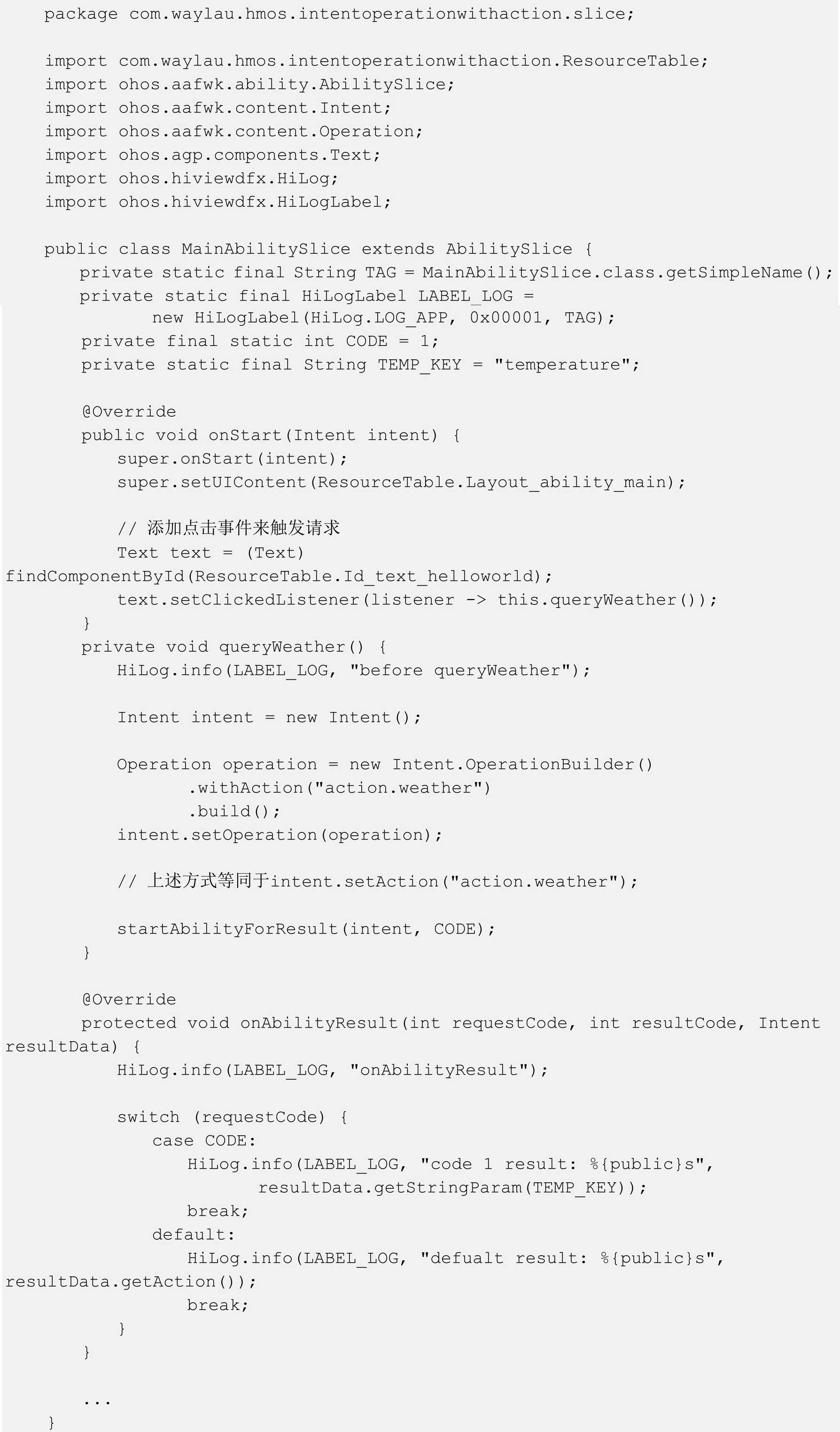 · 重写了onAbilityResult方法,用来接收请求的返回值。注意resultData获取的返回参数的值是字符串,以此需要用getStringParam方法;如果是整型,则可以使用getIntParam方法。