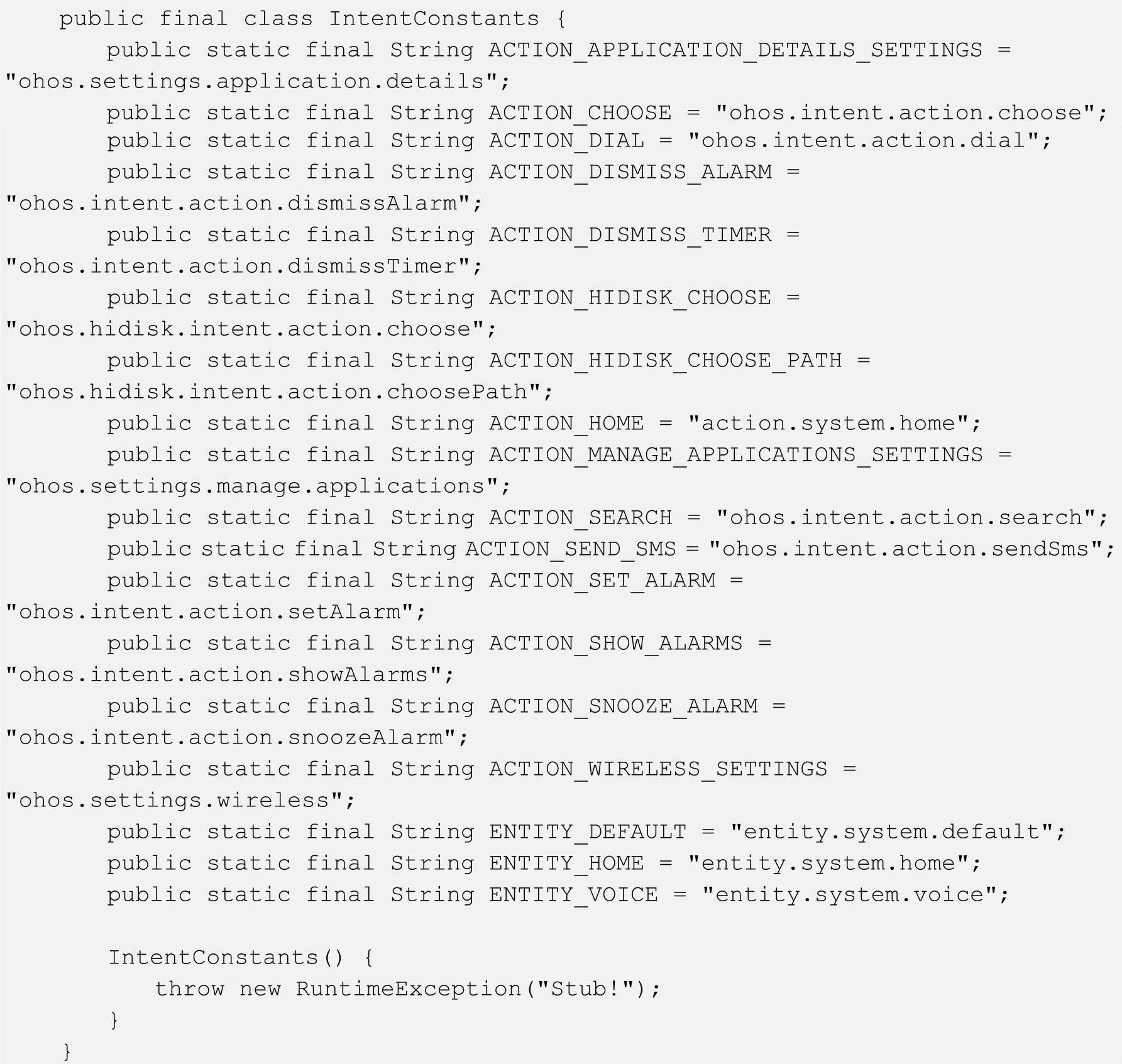 IntentConstants定义了众多的系统应用常量值,比如搜索、发短信等,这些系统应用都可以参照拨号盘的方式来启动。IntentConstants源码如下: