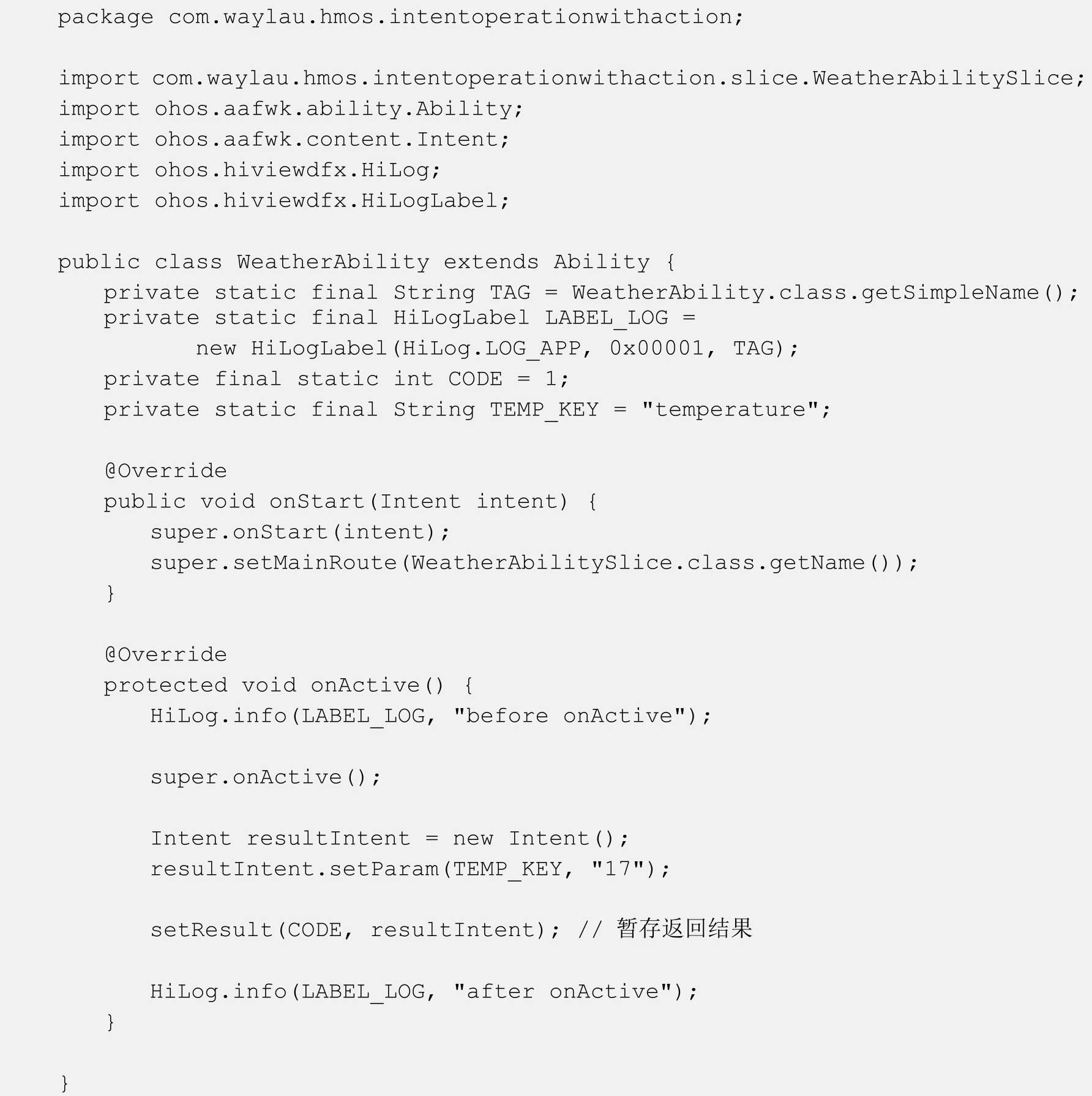 · 通过Parameters的方式来传递天气信息。Parameters是一种支持自定义的数据结构,通过setParam方法将温度17放到resultIntent中。