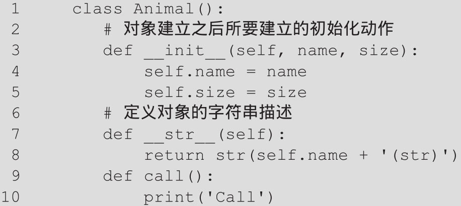 下面这个示例建立了一个Animal类,它有两个属性name和size、一个方法call()。初始化(__init__)给定一个名称。它的字符串描述(__str__)会是“名称(str)”。
