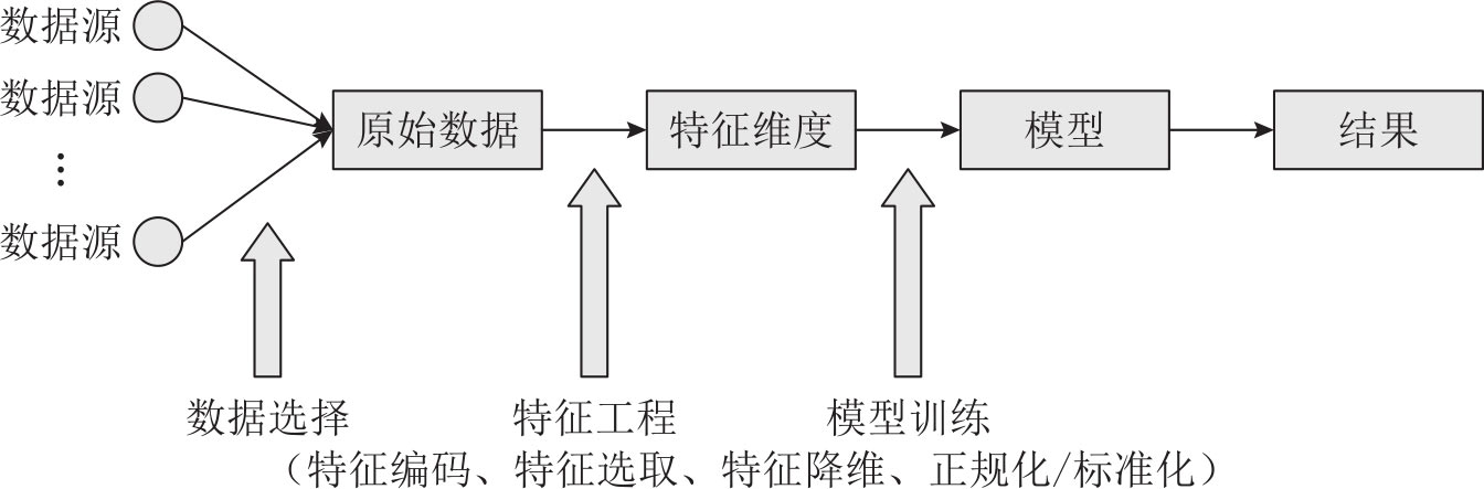 人们一般在数据分析的范畴中把数据清理和特征工程放在数据预处理环节一起讨论,但是在kaggle竞赛中,通常会把数据清理视为“处理遗失值”这个动作,也把特征工程视为一个独立过程。常见的特征工程包括特征编码(Categorical Encoding)、特征选取(Feature Selection)、特征降维(Dimensionality Reduction)、正规化(Normalization)/标准化(Standardization),如图1.5所示。