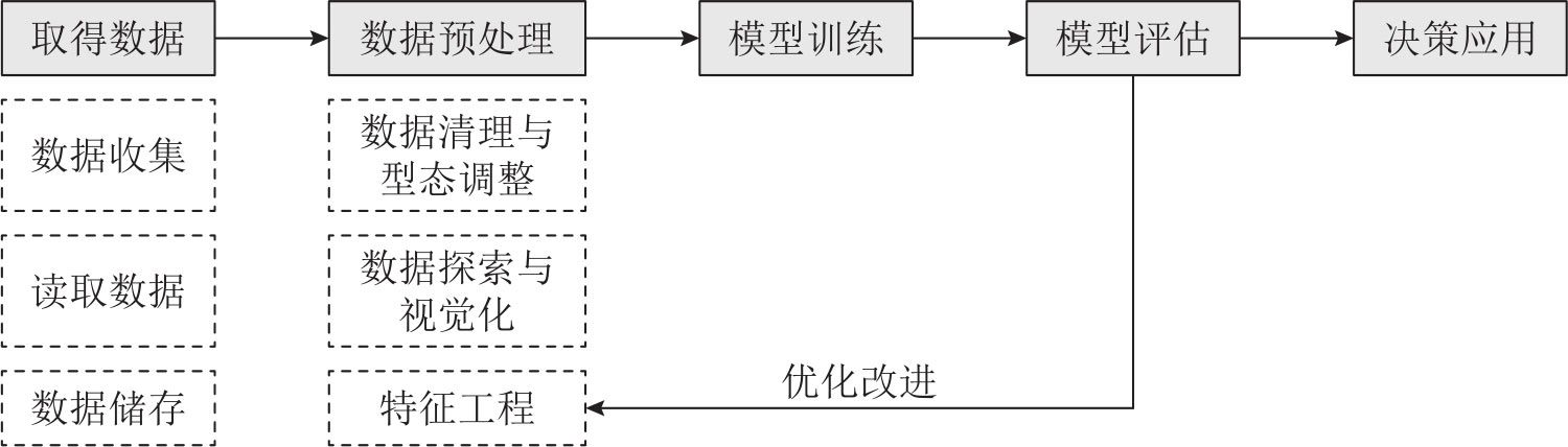 数据项目的分析流程是:从数据开始,通过一连串的过程发现隐藏在数据中的规则,利用这些规则完成一些有趣的应用,大致概括为取得数据—数据预处理—数据转换—数据分析—数据解释—发现知识。