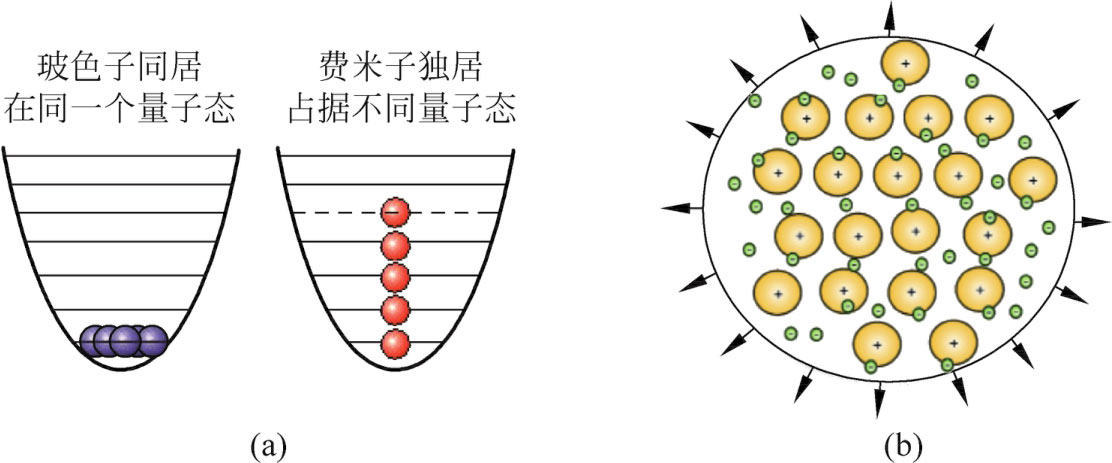 白矮星主要由碳构成,作为氢合成反应的结果,外部覆盖一层氢气与氦气。一般来说,白矮星中心温度高达10 7 K,如此高温下,原子只能以电离形态存在。也就是说,白矮星可以看成是由紧密聚集在一起的离子以及游离在外的电子构成,就像是一堆密集的原子核,浸泡在电子“气”中,如图1-4-1(b)所示。原子核提供了白矮星的大质量和高密度,游离电子气则因为遵循泡利不相容原理而产生了抗衡引力坍缩的“电子简并压”。