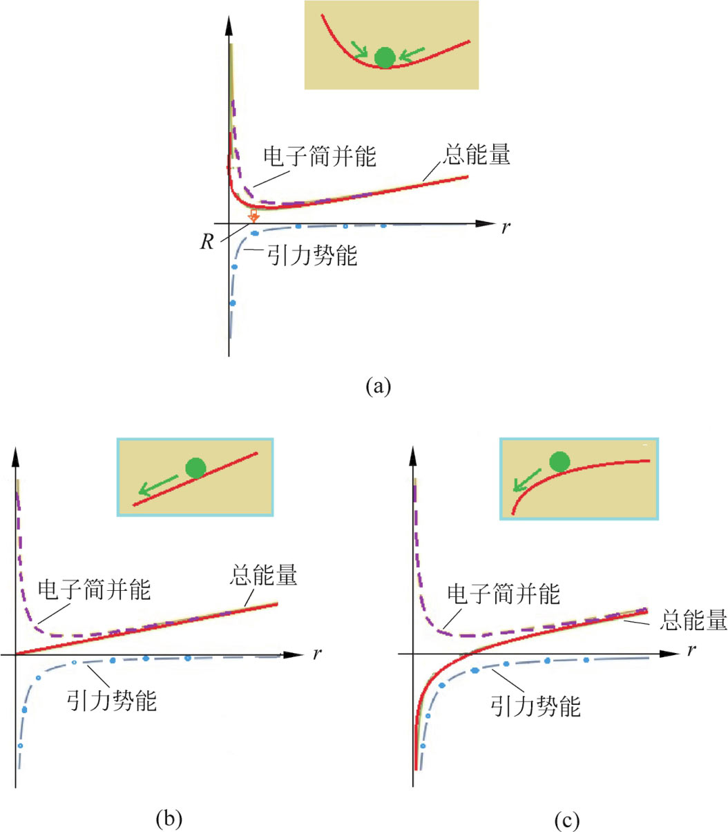 图1-4-2中画出了电子简并能及引力势能随着恒星半径 r 的变化曲线。图(a)、(b)、(c)分别表示恒星的质量小于、等于、大于1.44倍太阳质量时的3种情况。电子简并能曲线不受恒星质量的影响,在3种情形中是相同的,但引力势能不同,与恒星质量大小密切相关。引力势能为负值表明是互相吸引,电子简并能的正值表示电子之间统计意义上的“排斥”。3个图中均以实线描述总能量,是由电子简并能和引力势能相加而得到的。从图(a)可见,当恒星的质量小于钱德拉塞卡极限时,总能量在 R 处有一个最小值,能量越小的状态越稳定,说明这时候恒星是一个半径为 R 的稳定的白矮星。而当恒星的质量等于或大于钱德拉塞卡极限时,半径比较小时的总能量曲线一直往下斜(从右向左看),没有极小值,因为系统总是要取总能量最小的状态,就将使得恒星的半径越变越小,而最后趋近于零,也就是说产生了引力坍缩。这3种情形可以类比于图右上方所画的小球在地面重力势能曲线上滚动的情况。只有在第一种情况下,小球才能平衡并达到静止。